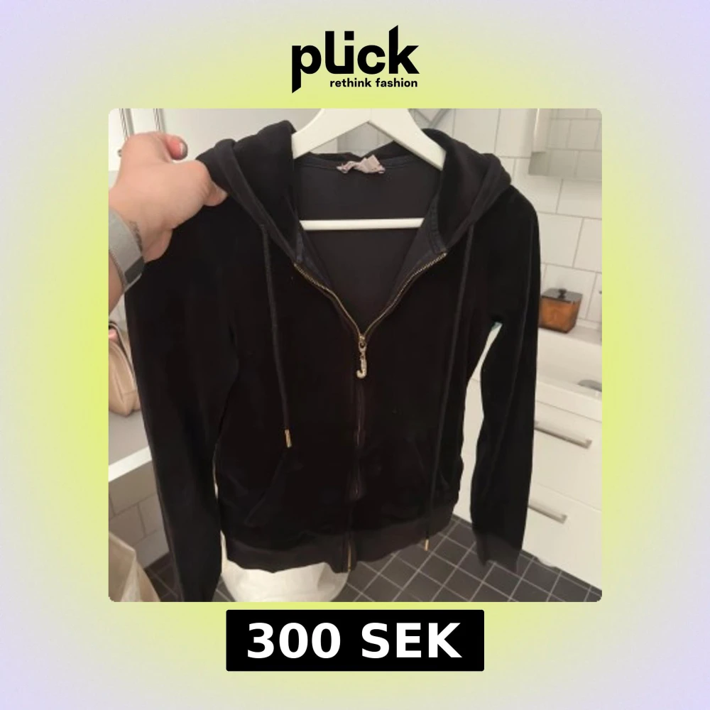 Säljer en klassisk svart hoodie i mjuk velour från Juicy Couture. Jackan har dragkedja framtill, huva med snören och ribbade muddar. Stl S