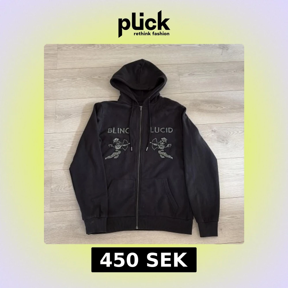 Svart hoodie från Blinglucid i storlek M med dragkedja och huva. Framsidan har strassdetaljer med texten 'BLING LUCID' och två änglar med pil och båge. Mjuk insida och ribbade muddar. Perfekt för dig som gillar bling och streetstyle. Använd fåtal gånger, hör av dig vid minsta fundering!