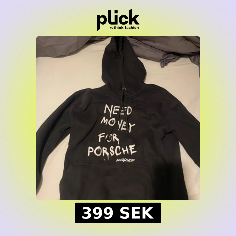 Svart hoodie med vit text 'NEED MONEY FOR PORSCHE' på bröstet och stor ficka framtill. Klassisk huva med snörning och långärmad modell. Perfekt för dig som gillar streetwear och vill sticka ut med ett coolt statement.