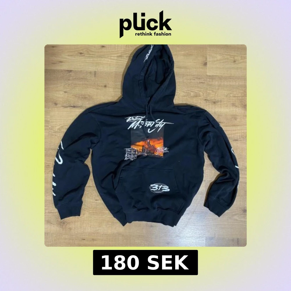 Svart hoodie från H&M med relaxed fit och coolt tryck på bröstet i orange och vitt. Snygga vita grafiska texter längs ärmarna och huva med snörning. Perfekt för dig som gillar streetstyle och vill sticka ut lite extra.
