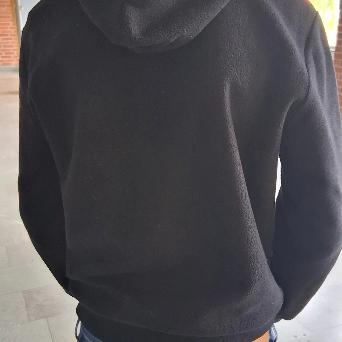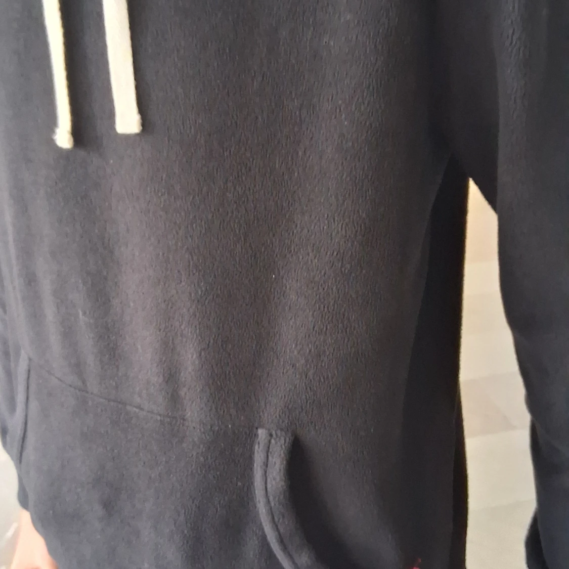 Svart hoodie med vit snörning och känguruficka framtill. Klassisk modell med huva och långa ärmar, perfekt för en chill och avslappnad stil. Liten röd detalj vid fickan. Mjuk och skön känsla i materialet.