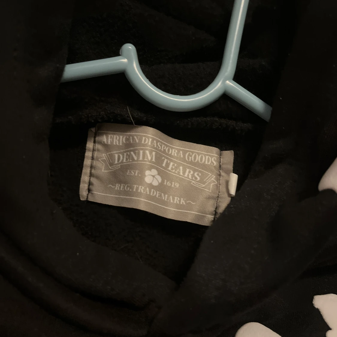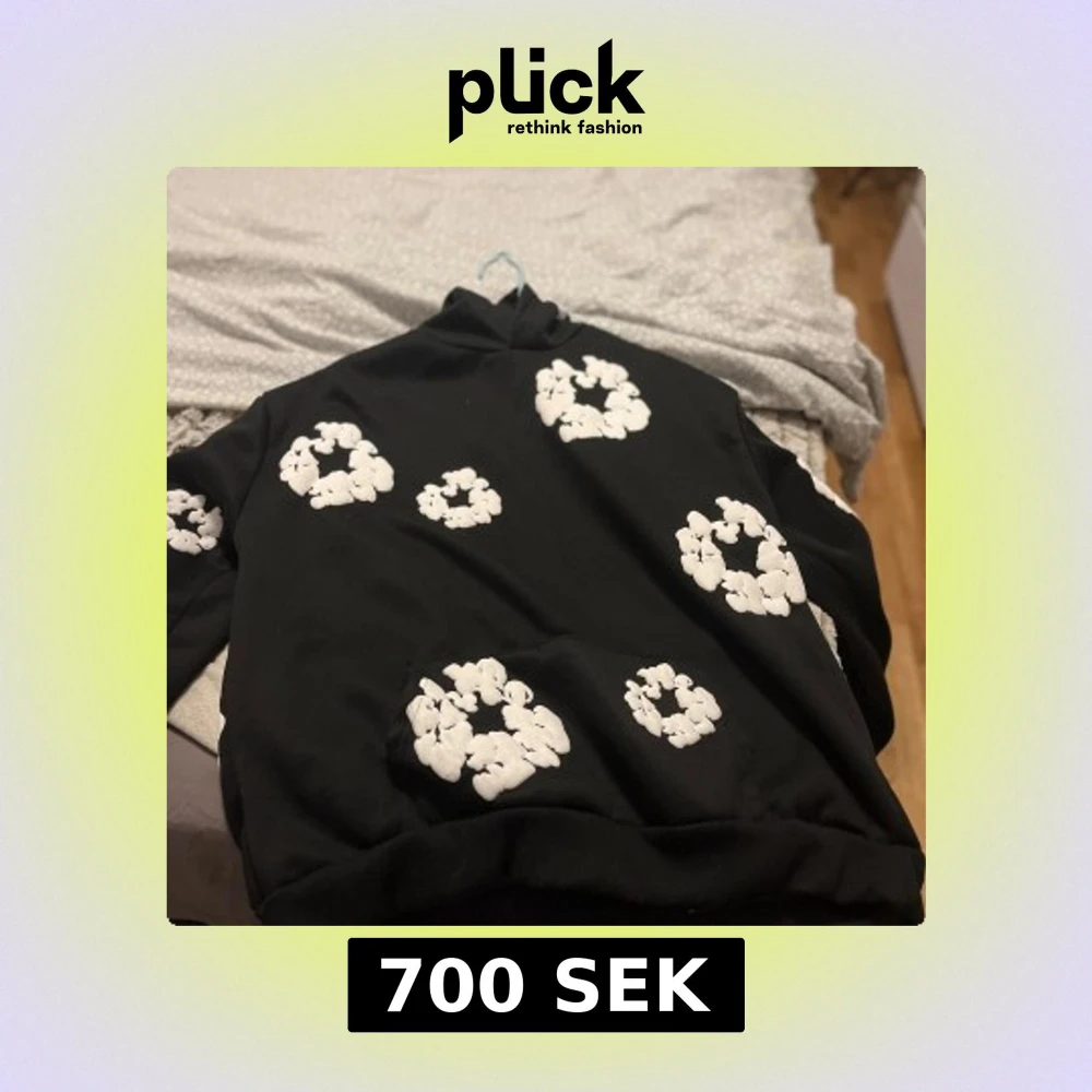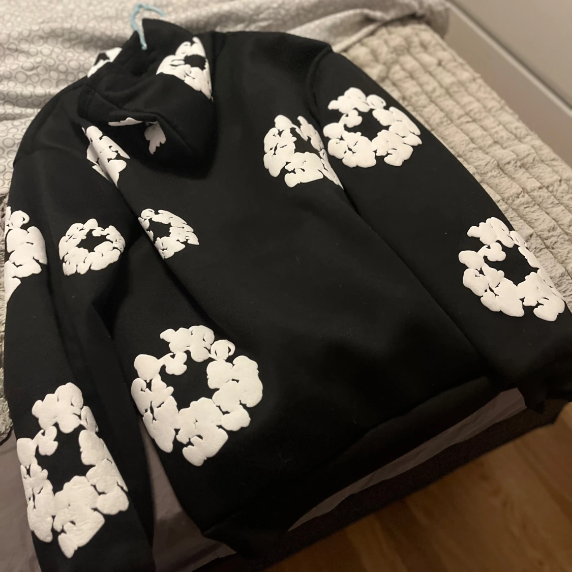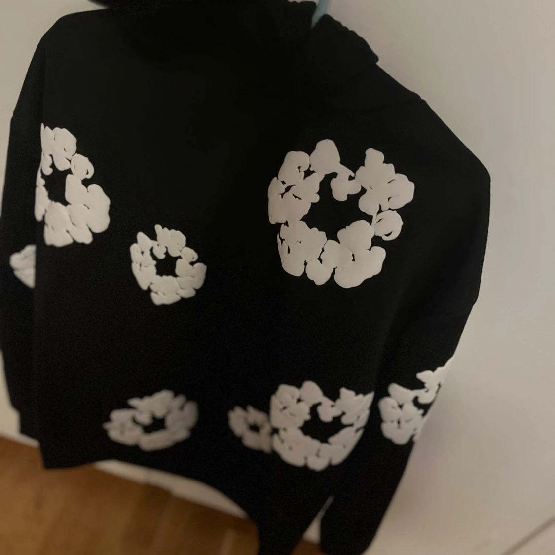 Snygg svart hoodie från Denim Tears med vita blommönster över hela tröjan. Perfekt för en unik och stilren look. Hoodien har en klassisk passform med långa ärmar och en bekväm huva.
