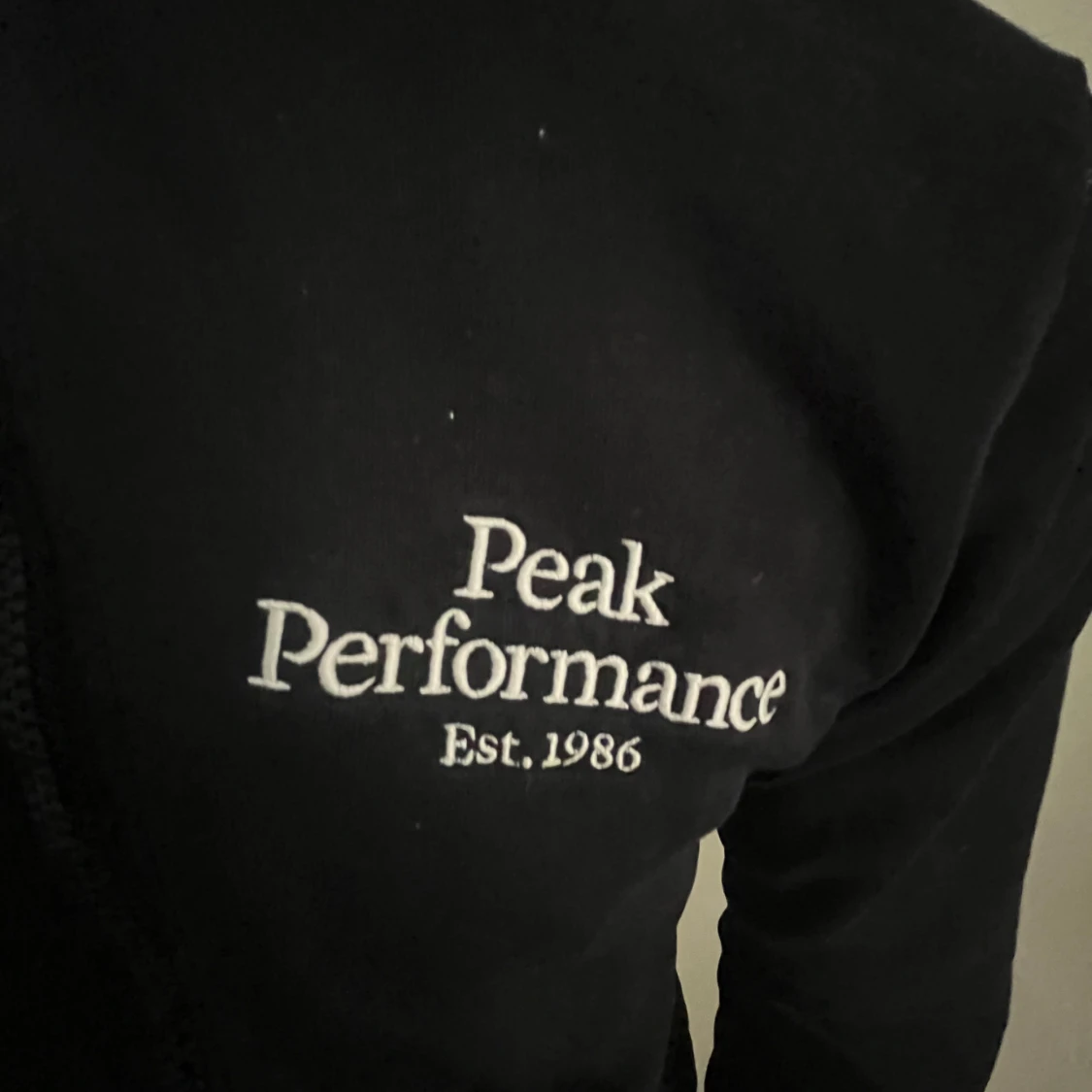 Peak performance hoodie-svart. Skulle säga att den är 8/10 på kvalité, vilket är bra!