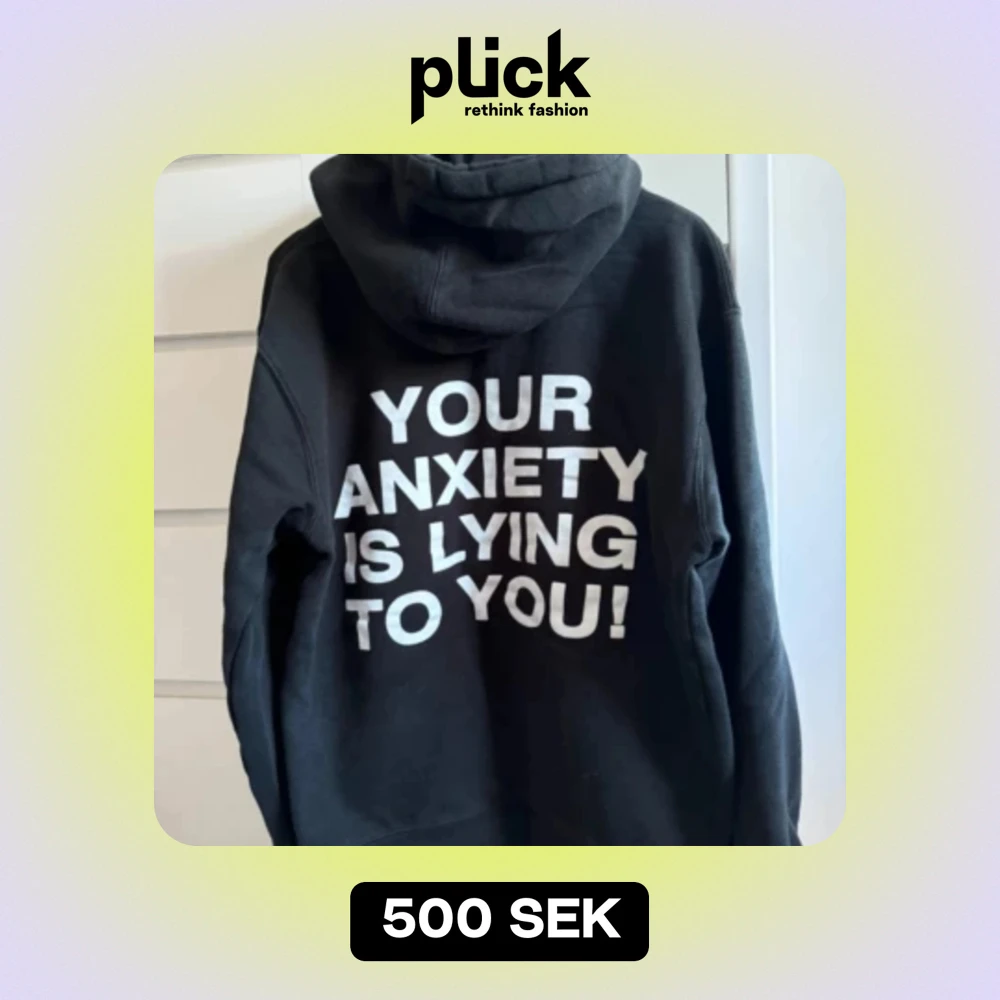 Svart hoodie med texten "YOUR ANXIETY IS LYING TO YOU HOODIE!" på ryggen. Från We’re Not Really Strangers. Har använts flitigt men har fortfarande mycket att ge. Storlek XS men sitter oversize så skulle säga att den passar allt från S till L. Nypris: