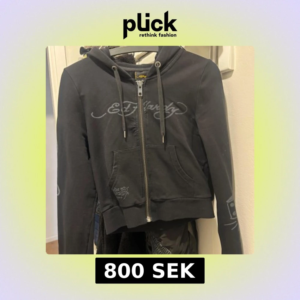 Svart hoodiejacka från Ed Hardy med dragkedja framtill och tryckt logga på bröstet. Stora fickor fram och coolt tatueringsinspirerat motiv på ryggen. Justerbar huva med snören och ribbade muddar.