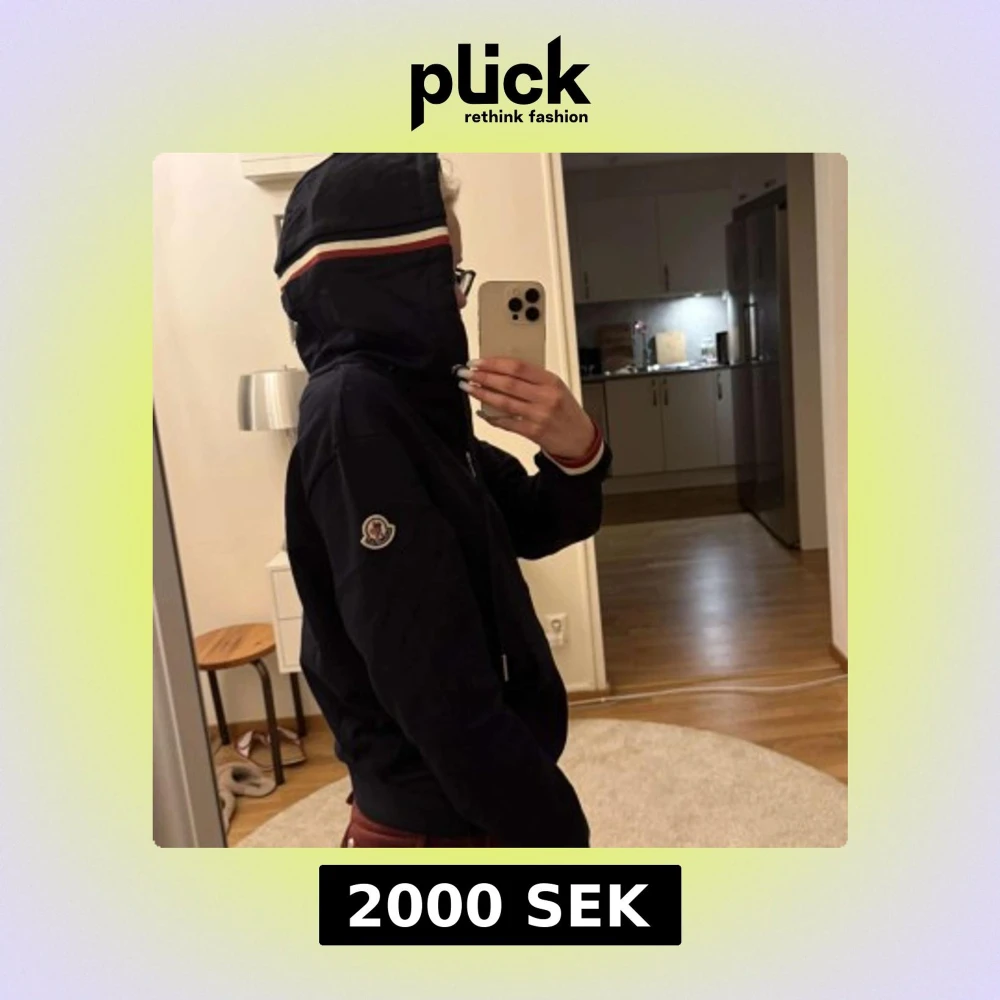 Mörkblå hoodie från Moncler med dragkedja framtill och huva. Hoodien har vita och röda ränder på huvan och ärmsluten, samt Moncler-logga på ärmen. Perfekt för en sportig och avslappnad stil. Passar till alla och är så mysig! Helt oanvänd endast tagit bilder i tröjan!