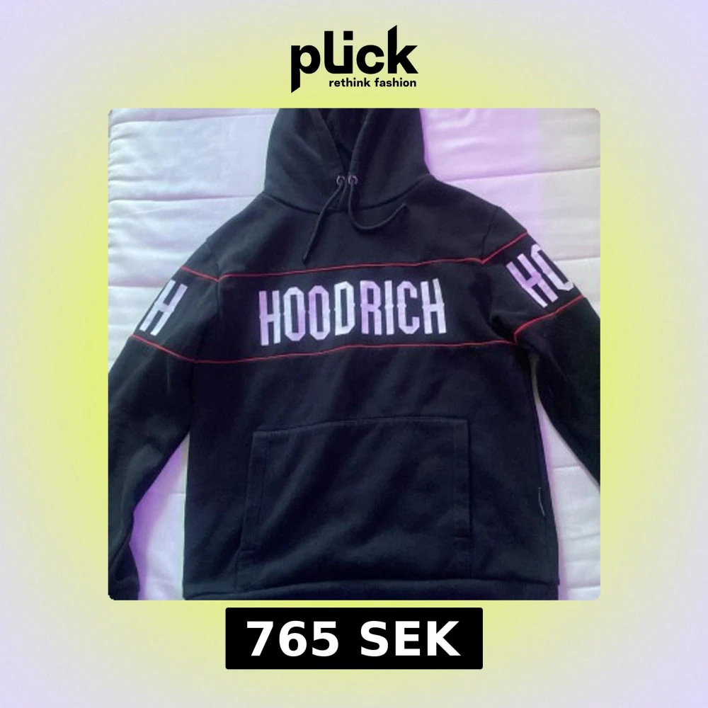 Svart hoodie från HOODRICH med stor vit logga på bröstet och ryggen samt på ärmarna. Röd linje går runt överdelen och ärmarna för extra stil. Tröjan har huva med snörning och en stor magficka. Perfekt för dig som gillar streetwear och vill sticka ut.
