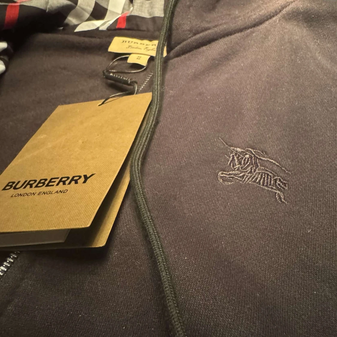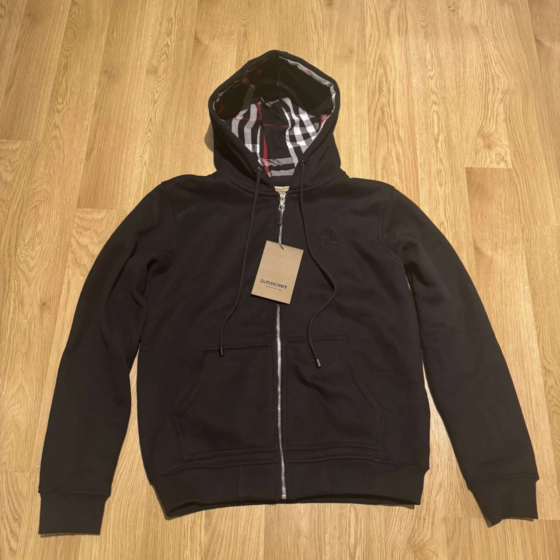 Säljer en stilren svart huvtröja från Burberry med dragkedja och klassiskt rutigt foder i huvan. Tröjan har en broderad logga på bröstet och ribbade muddar vid ärmslut och nederkant. Perfekt för en casual look! Har storlek S och L.