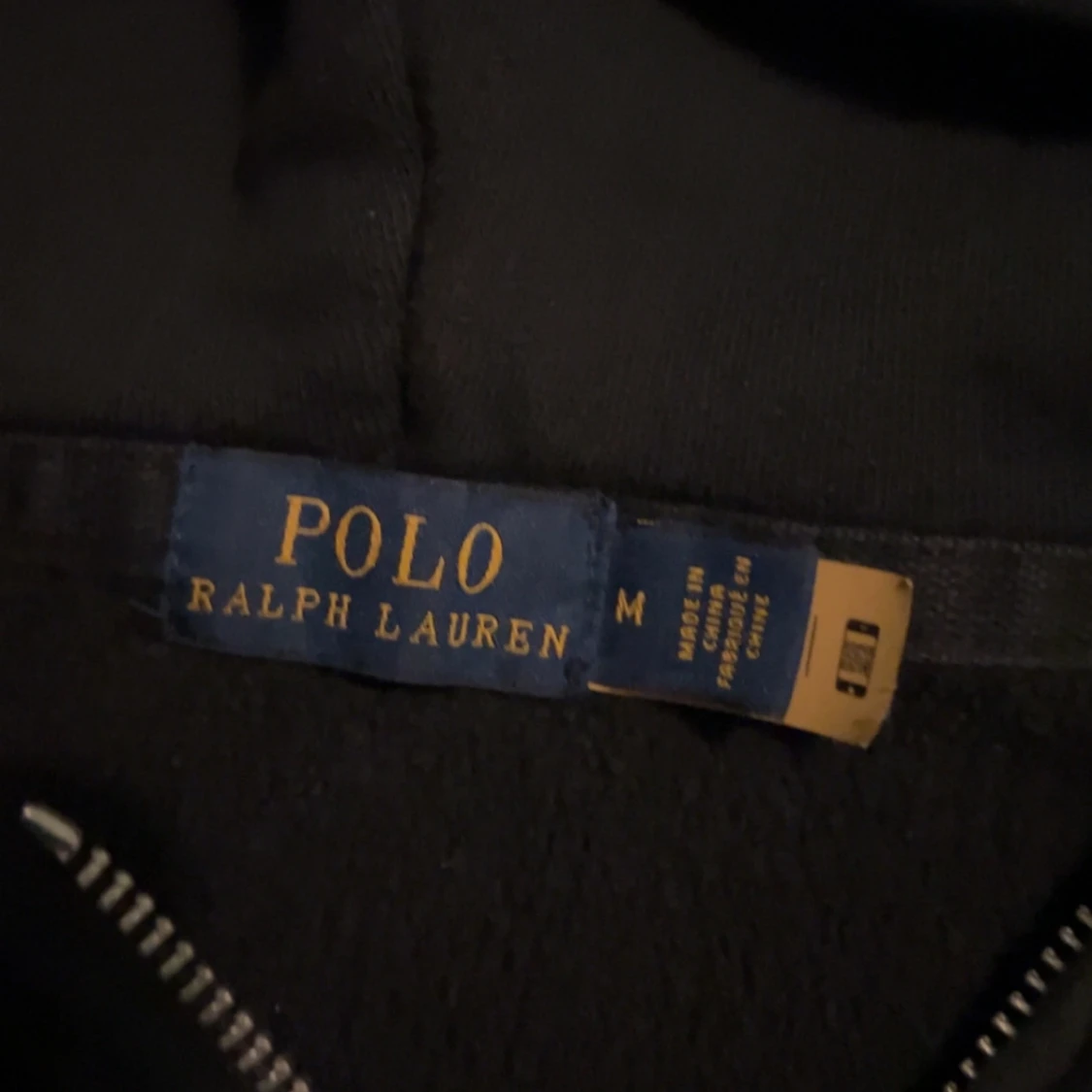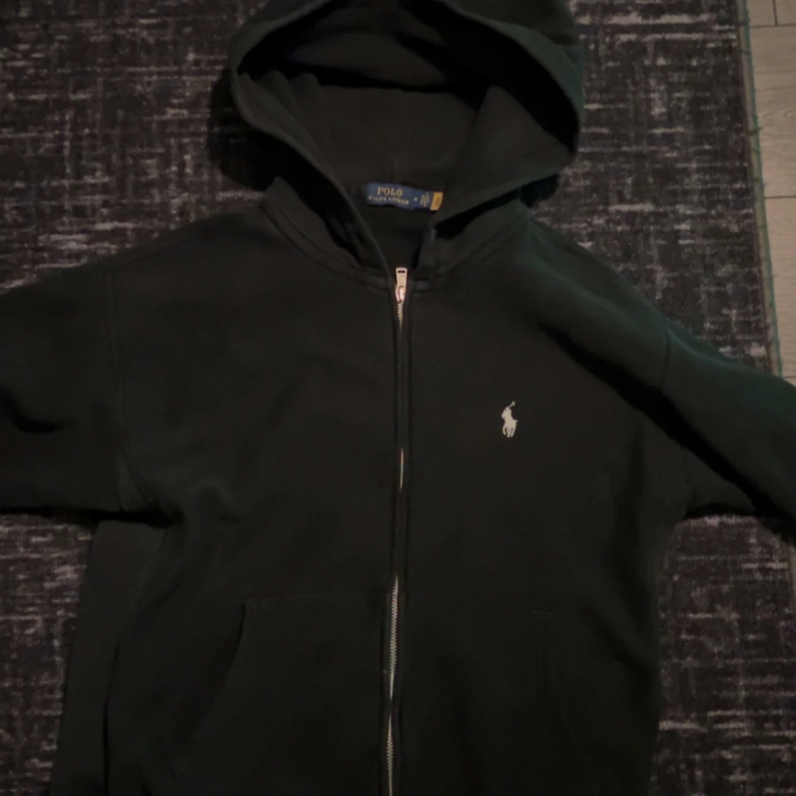 Säljer en svart huvtröja från Polo Ralph Lauren med dragkedja och broderad logga på bröstet. Perfekt för en casual look med sin klassiska design och bekväma passform.