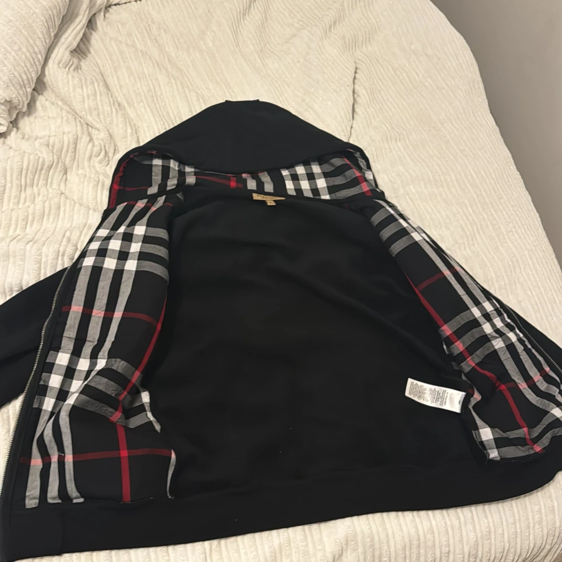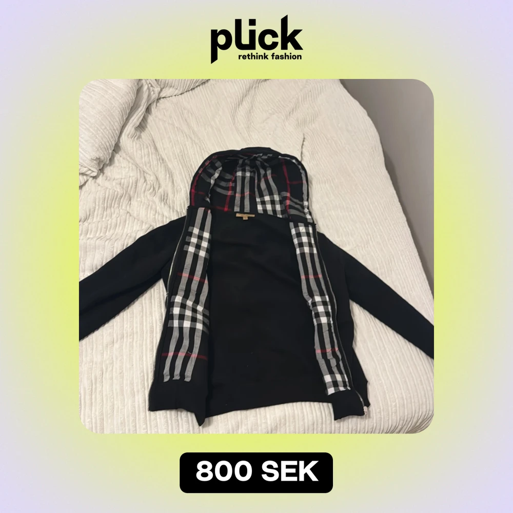 Säljer en snygg svart kofta från Burberry med klassiskt rutigt mönster i fodret. Koftan har långa ärmar och dragkedja framtill. Perfekt för höst och vår! 🖤