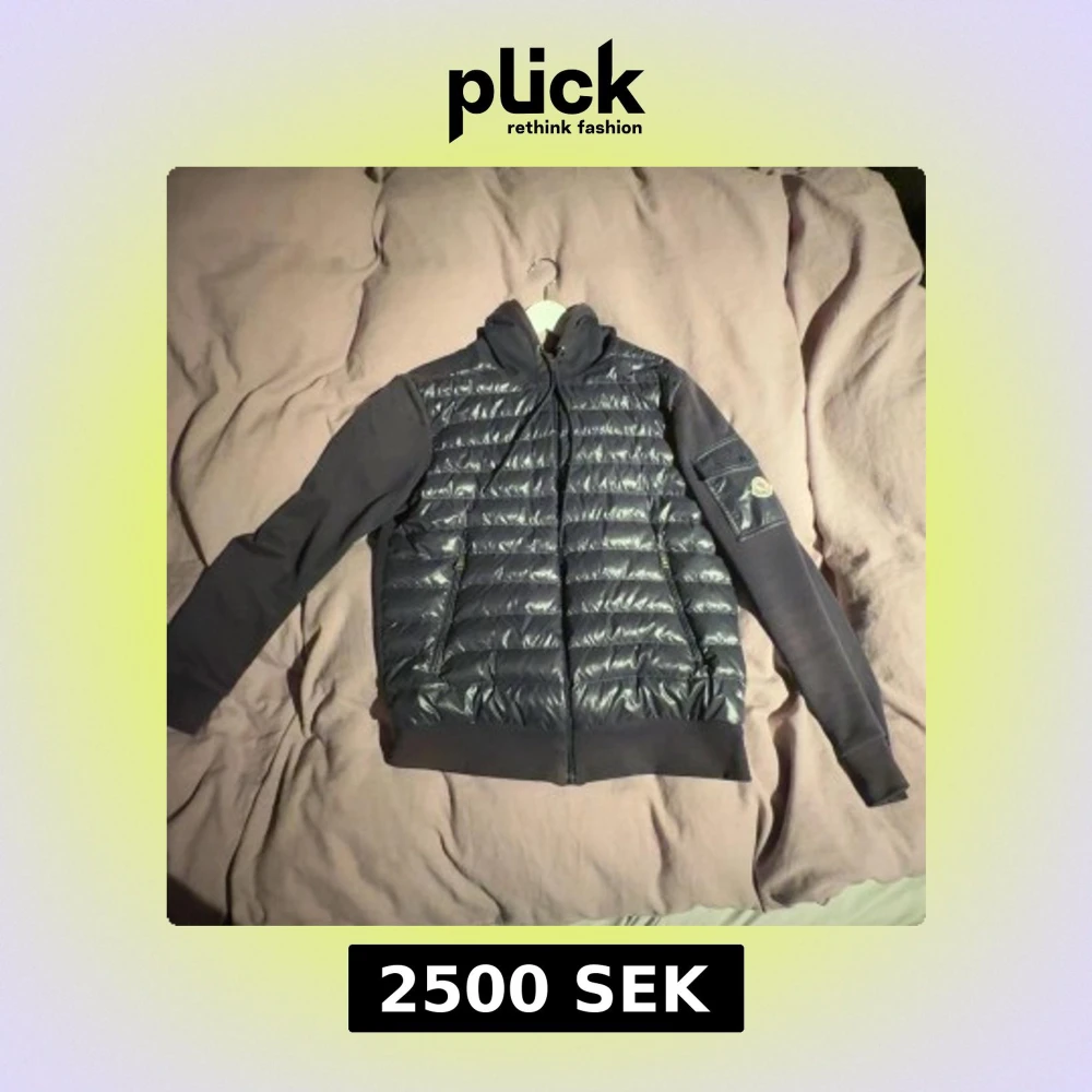 Snygg svart jacka från Moncler med quiltad framsida och dragkedja. Jackan har långa ärmar och en praktisk ficka med knapp på ärmen. Perfekt för kyligare dagar. Är lite solblekt som syns på bilderna men några skador