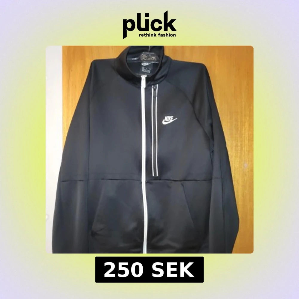 Säljer en stilren svart jacka från Nike med vit dragkedja och logga på bröstet. Jackan har långa ärmar och en hög krage. Perfekt för en sportig look eller avslappnade dagar.