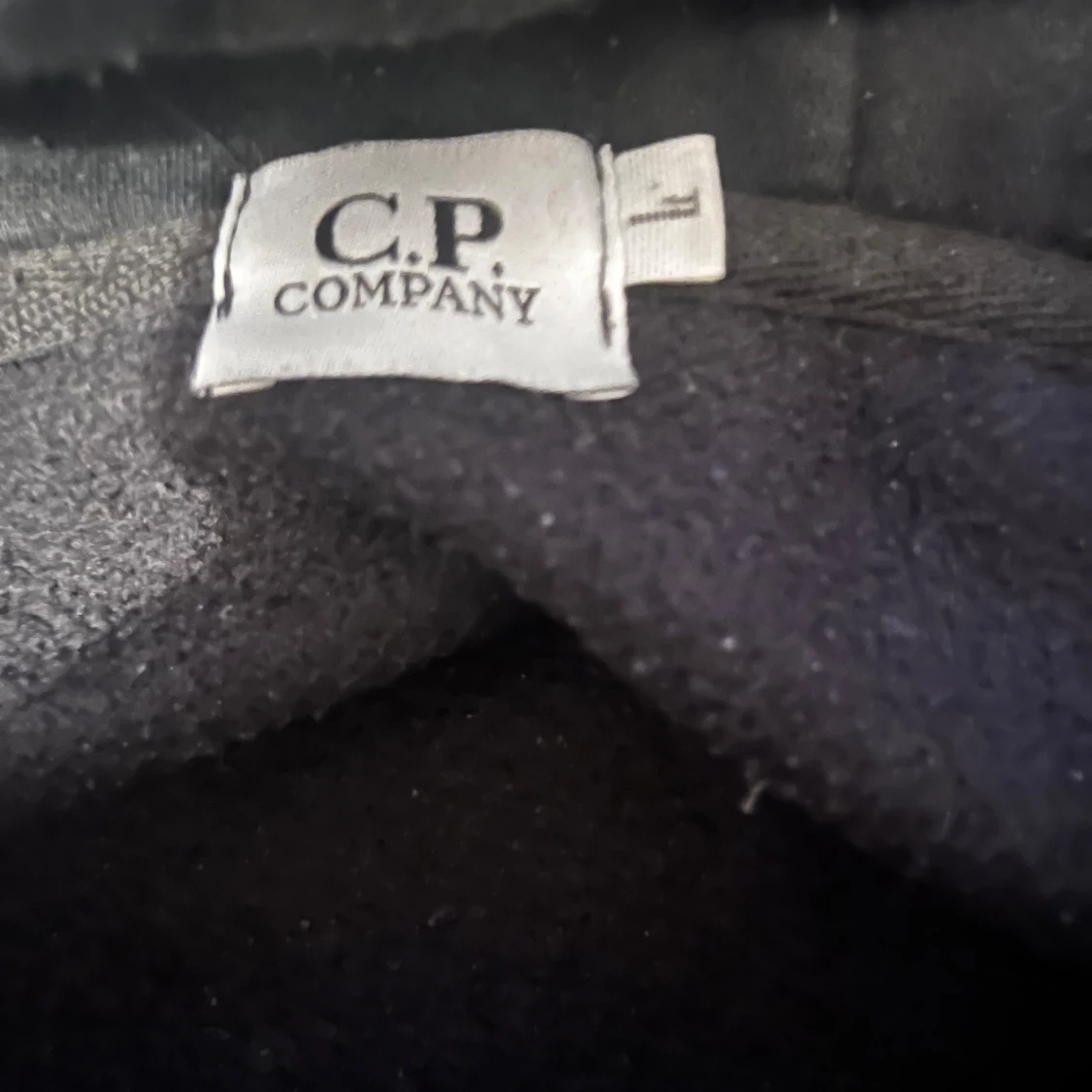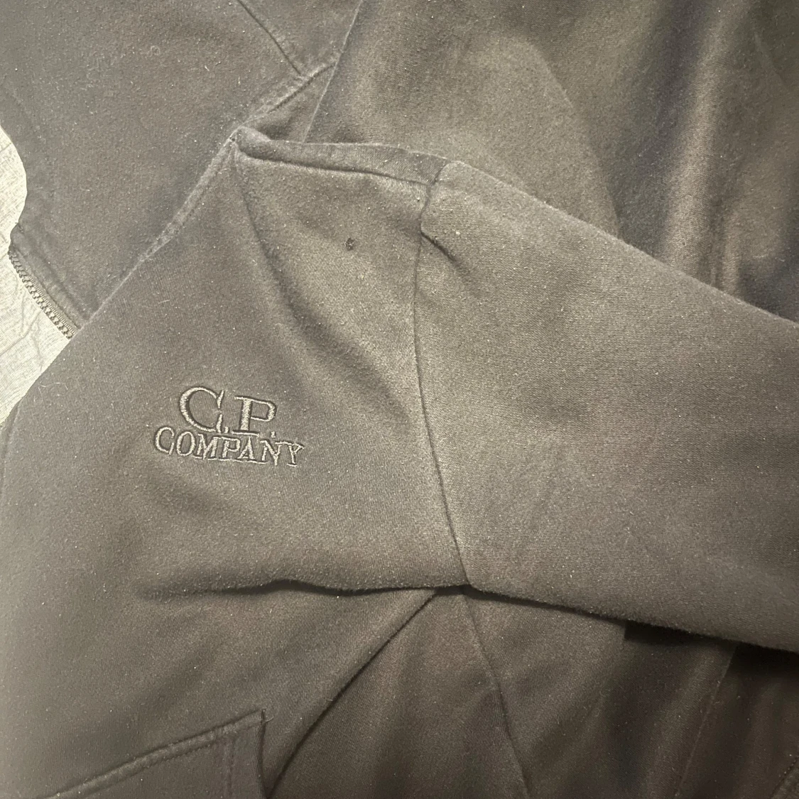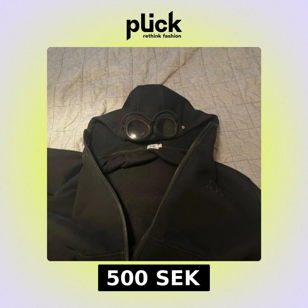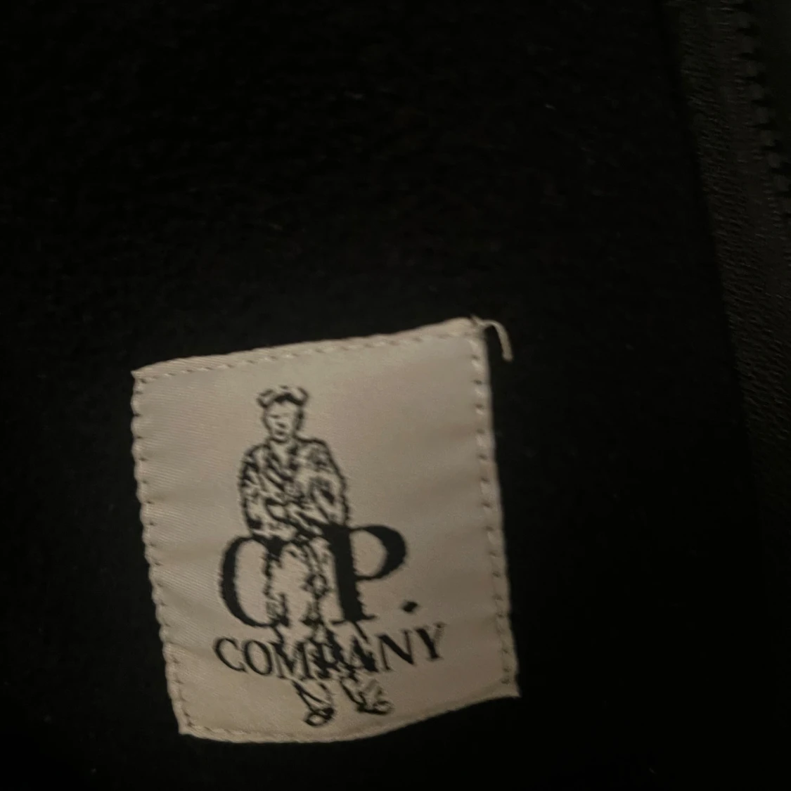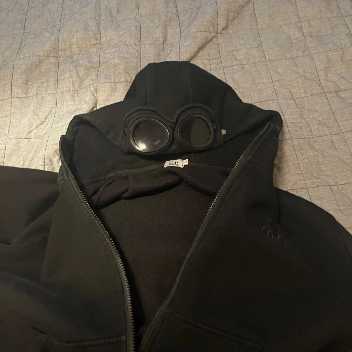 Säljer en svart jacka från C.P. Company med inbyggda glasögon i huvan. Jackan har dragkedja och är långärmad, perfekt för en unik stil. Märkesloggan är broderad på bröstet.
