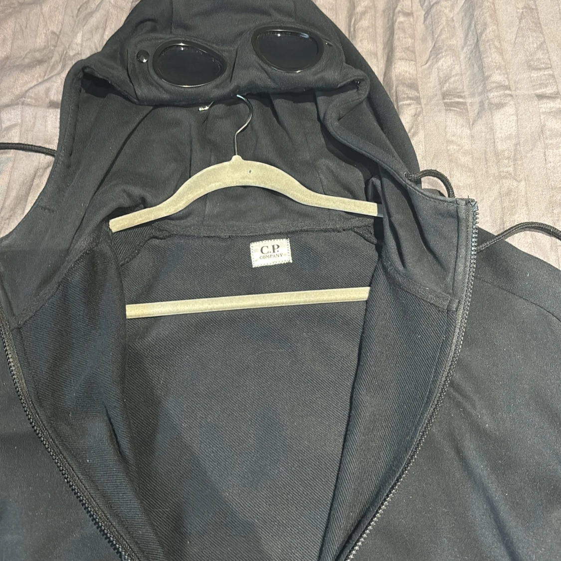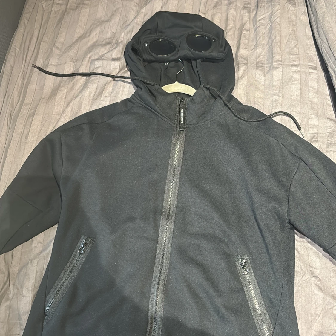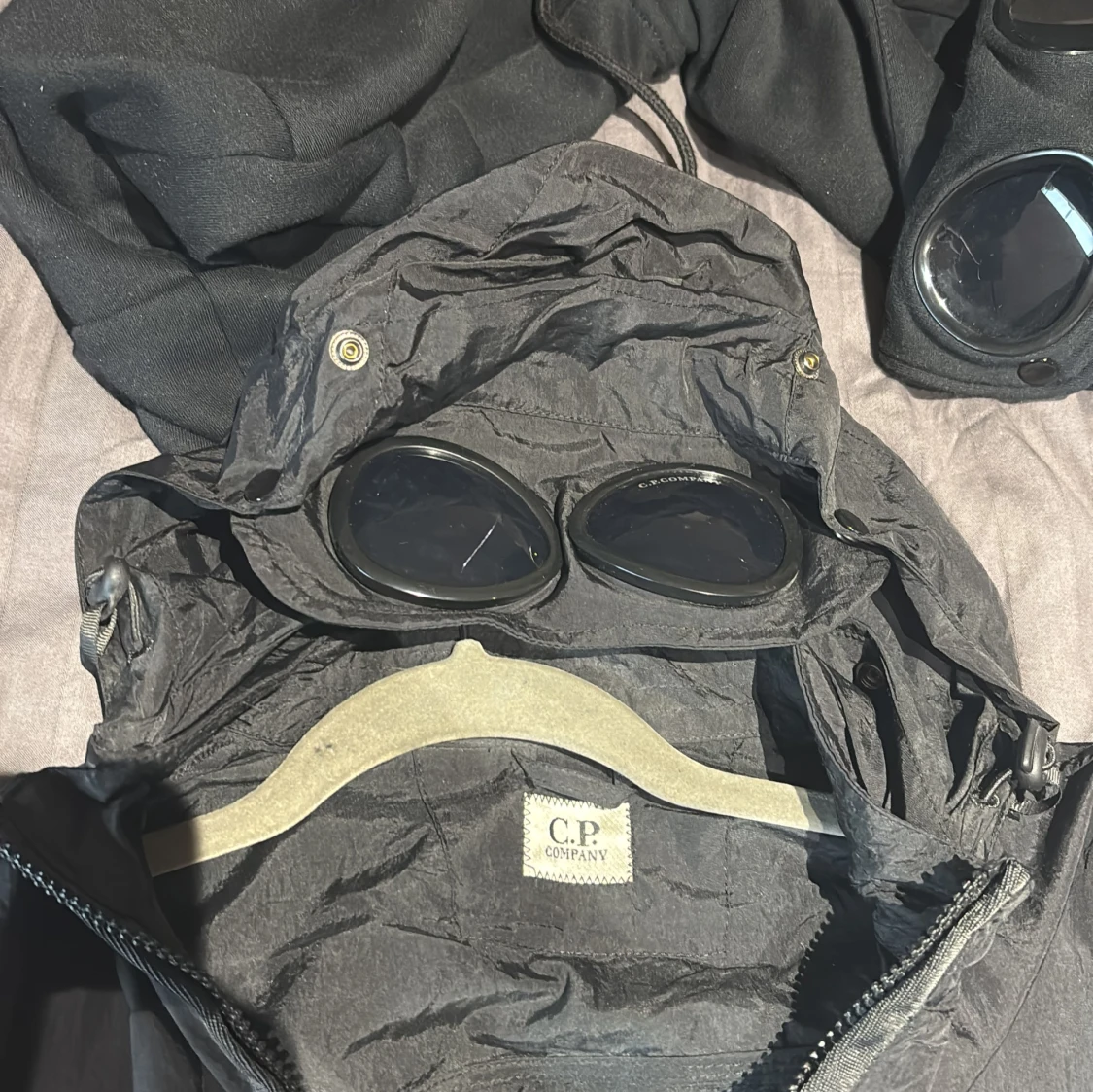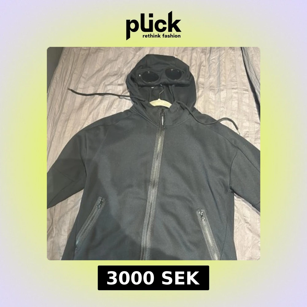 Säljer en svart jacka från C.P. Company med unik design. Jackan har en huva med inbyggda glasögon och dragkedja framtill. Perfekt för en stilren och funktionell look. 1500 för en eller 2900 för båda