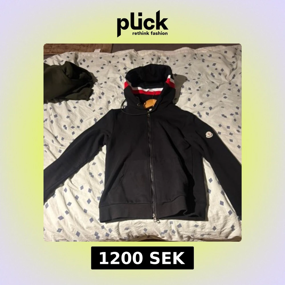 Svart hoodie från Moncler med hel dragkedja och huva. Insidan av huvan har snygga ränder i rött, vitt och svart. Tröjan har Moncler-logga på ärmen och praktiska fickor framtill. Perfekt för dig som gillar stilrena och exklusiva streetwear-plagg.