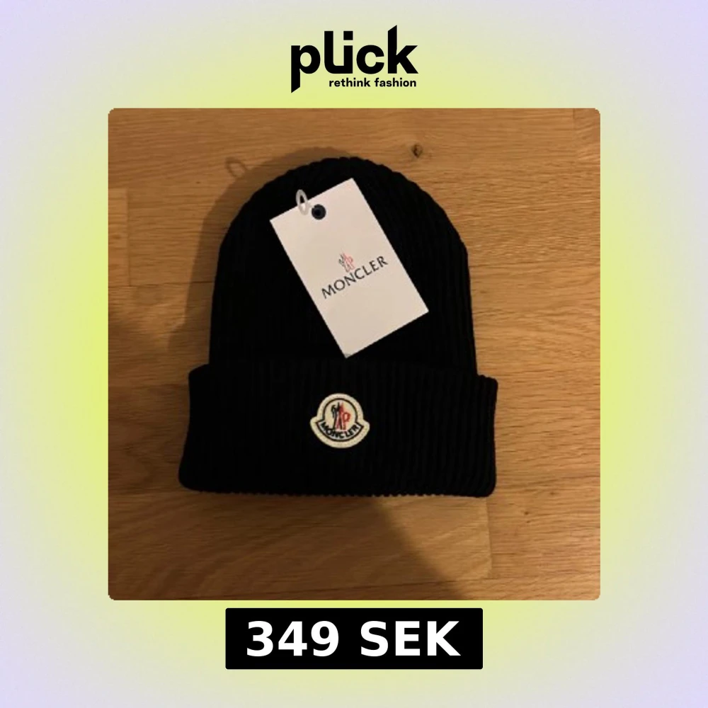 Snygg svart ribbad mössa från Moncler med broderad logotyp framtill. Perfekt för att hålla värmen under kyliga dagar. Stilren design som passar till det mesta. Helt ny och skickas samma dag.