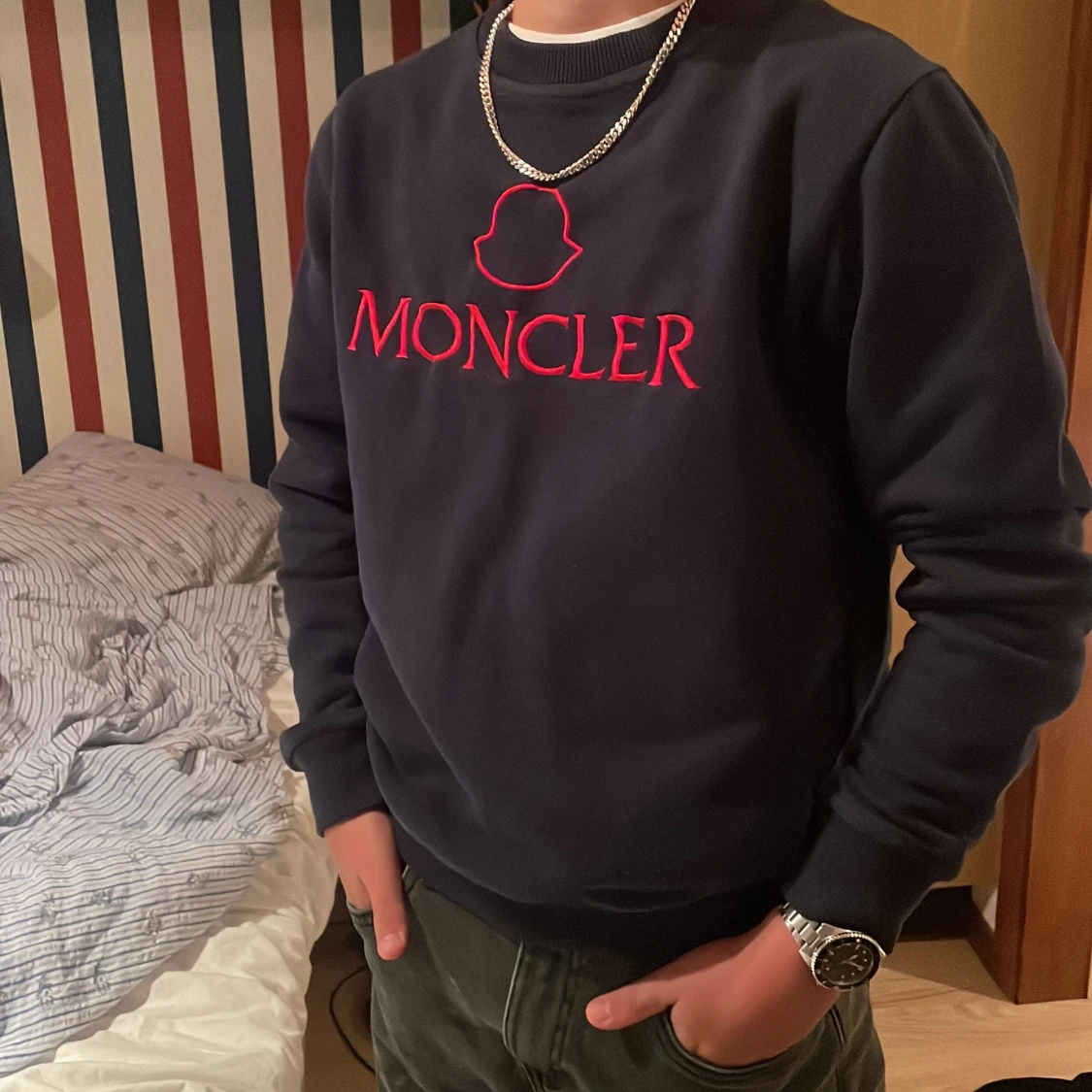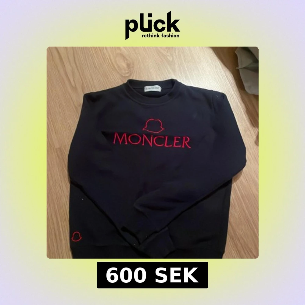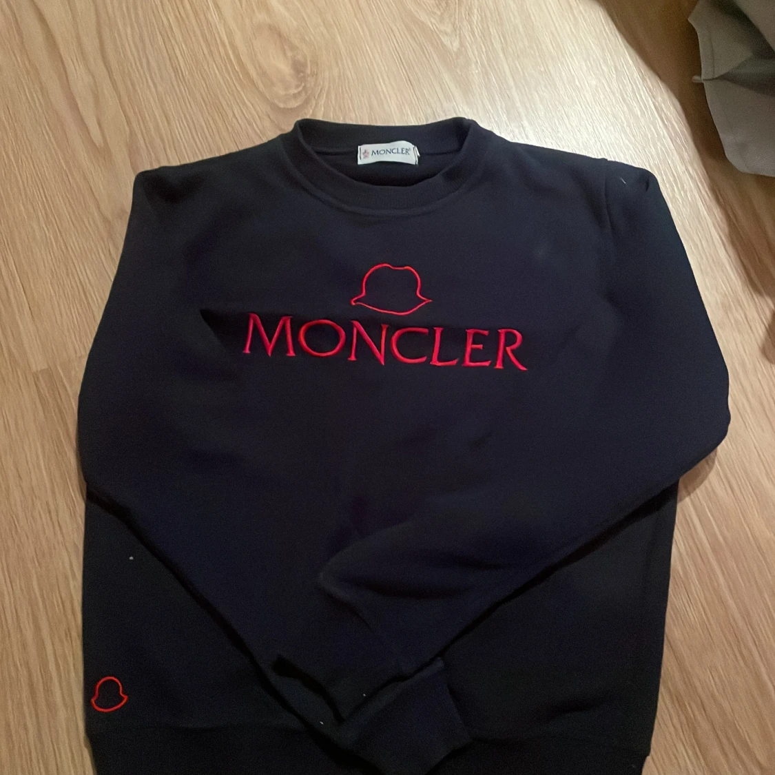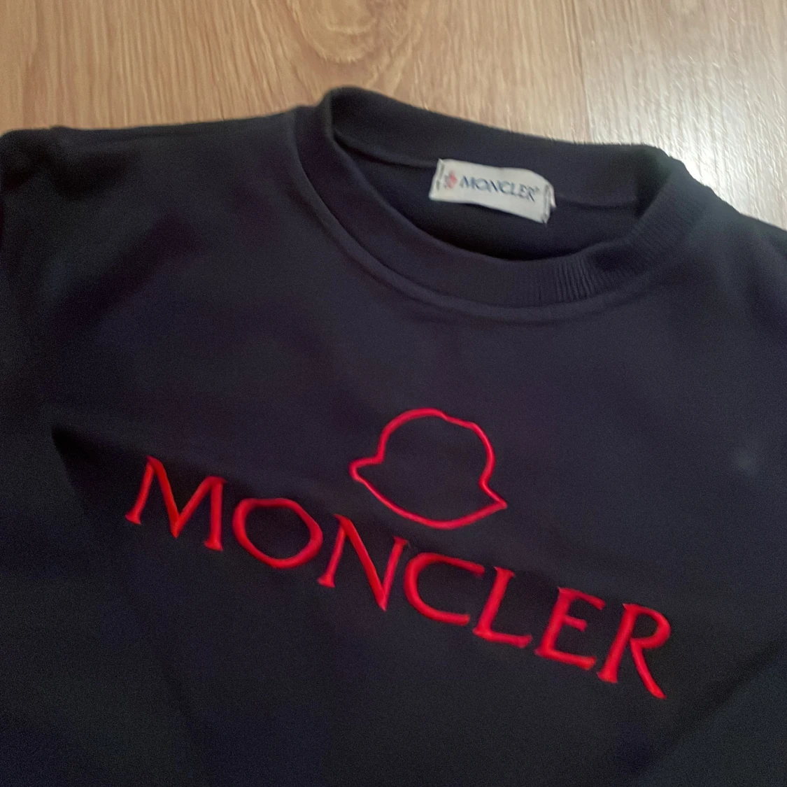 Svart sweatshirt från Moncler med röd broderad logga och text på bröstet. Klassisk rund halsringning och långa ärmar. Tröjan har en clean look med en extra liten röd logga vid nederkanten. Perfekt för dig som gillar stilrena designer med en lyxig touch.