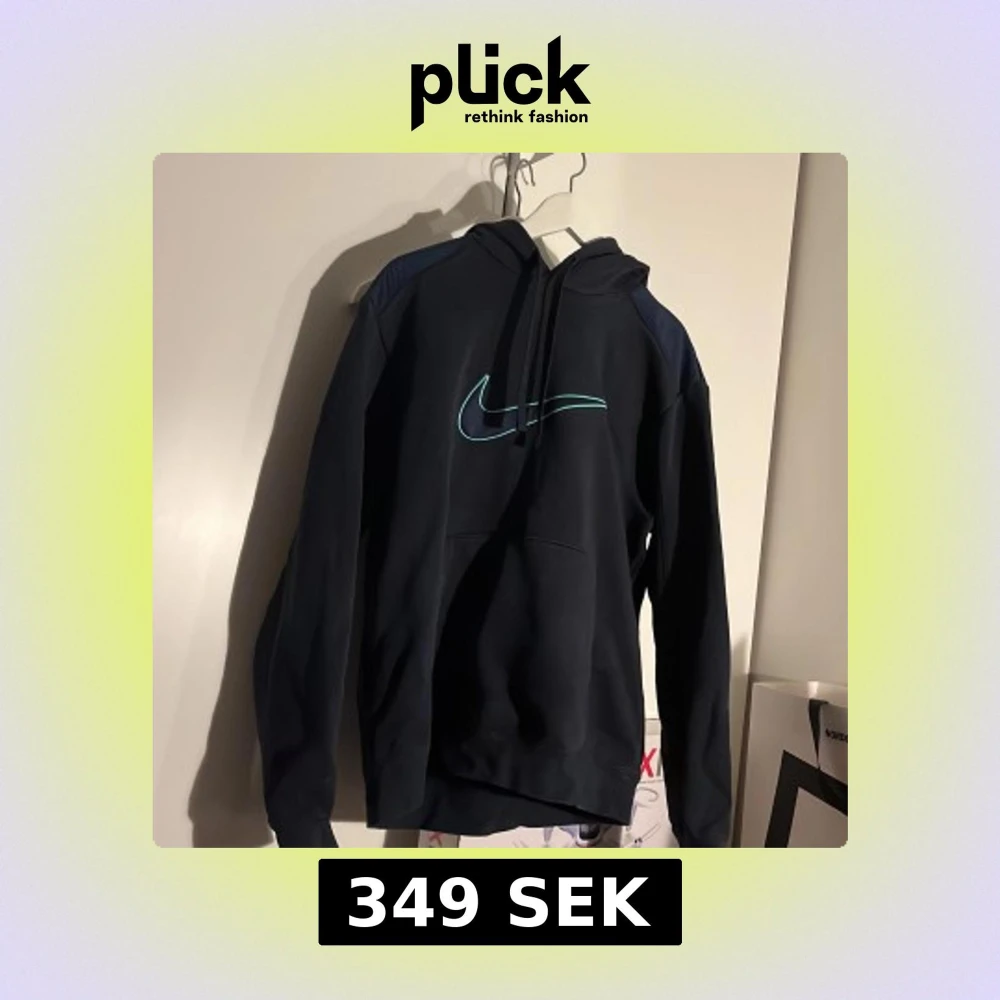 Svart hoodie från Nike med stor turkos Swoosh-logga på bröstet. Klassisk känguruficka framtill, huva med snörning och långa ärmar. Perfekt för dig som gillar sportig och avslappnad stil. Pris kan diskuteras vid snabb affär.