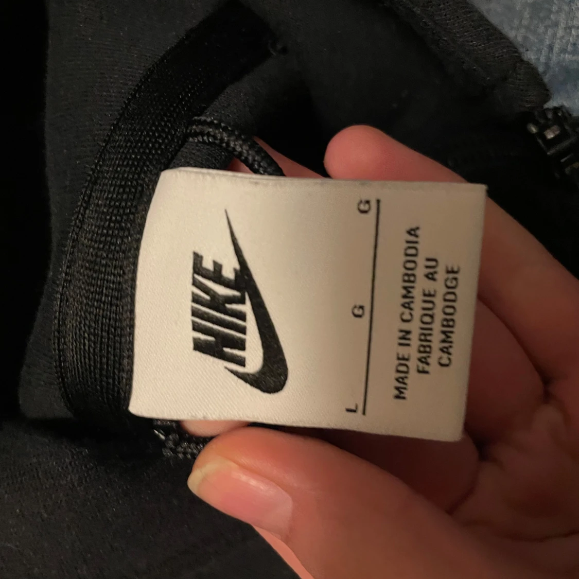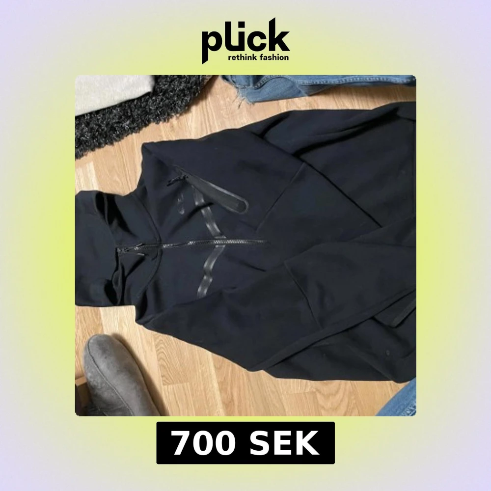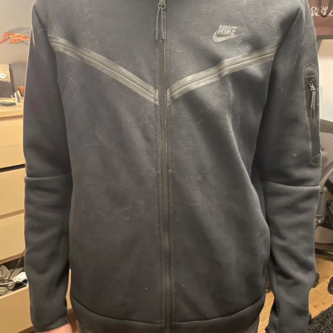 Säljer en svart jacka från Nike med dragkedja och huva. Jackan har en diskret logga på bröstet och en ficka med dragkedja på ärmen. Perfekt för en sportig look!