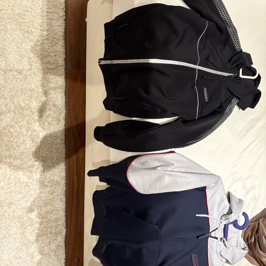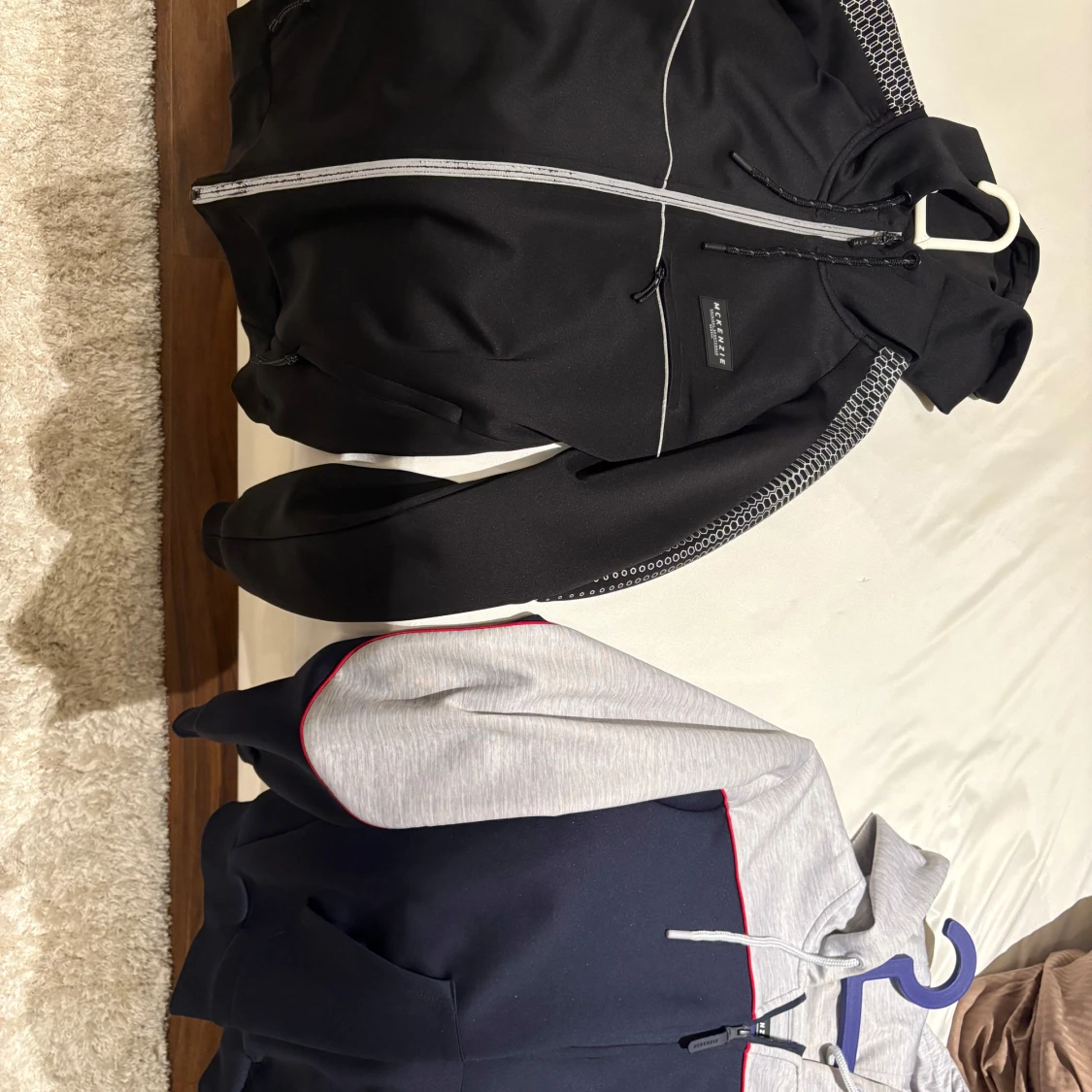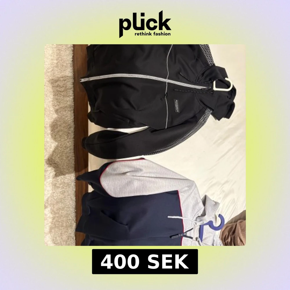 Säljer en svart huvtröja med dragkedja och vita detaljer. Den har en praktisk huva och är långärmad. Perfekt för en casual look. Båda är storlek M, båda koftorna får ni för 200 kronor, men ni kan välja att bara köpa en av koftorna för 150 kronor