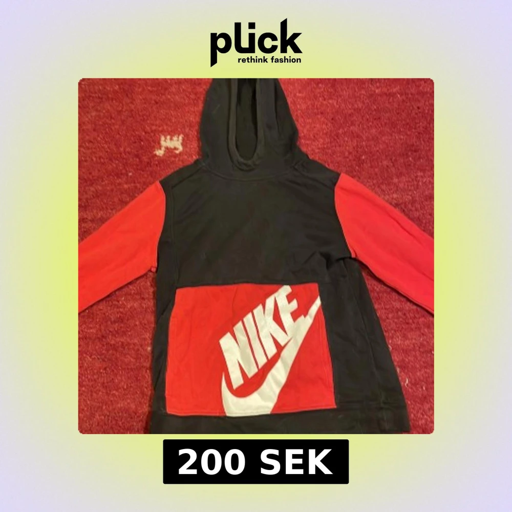 Säljer en cool svart och röd hoodie från Nike med stor logga på framsidan. Hoodien har långa ärmar och en praktisk ficka framtill. Perfekt för en cool look eller avslappnade dagar.
