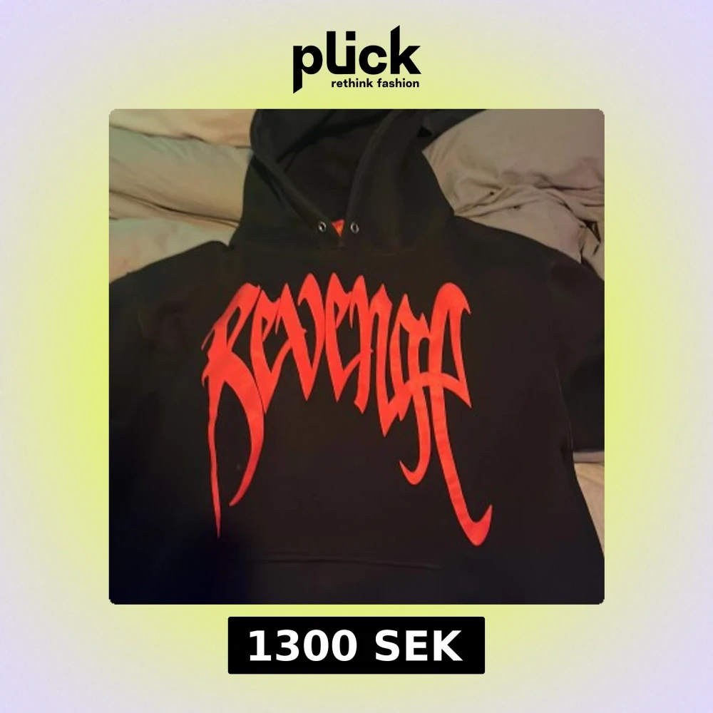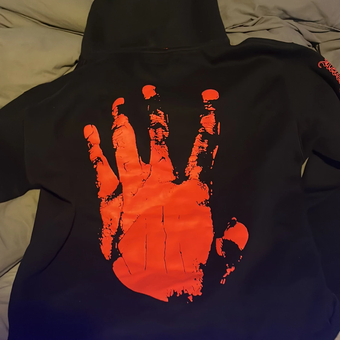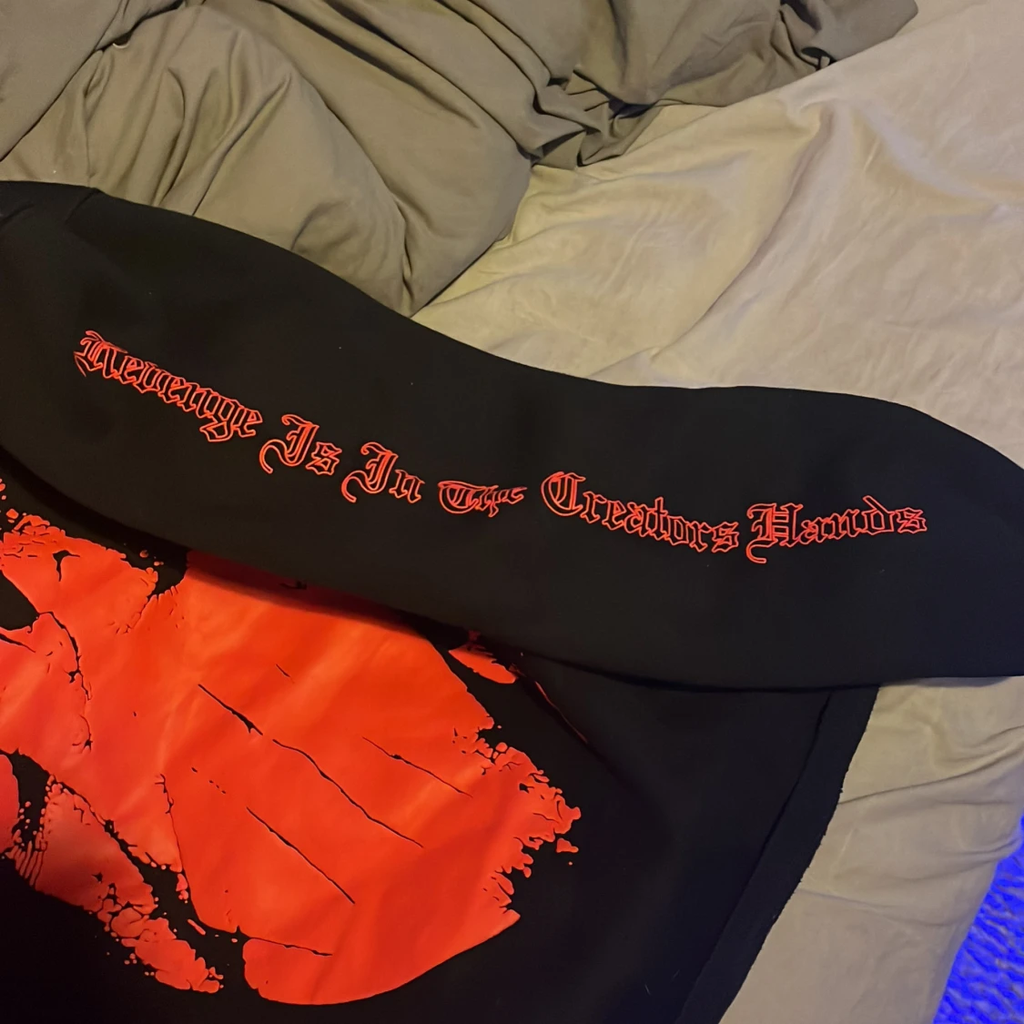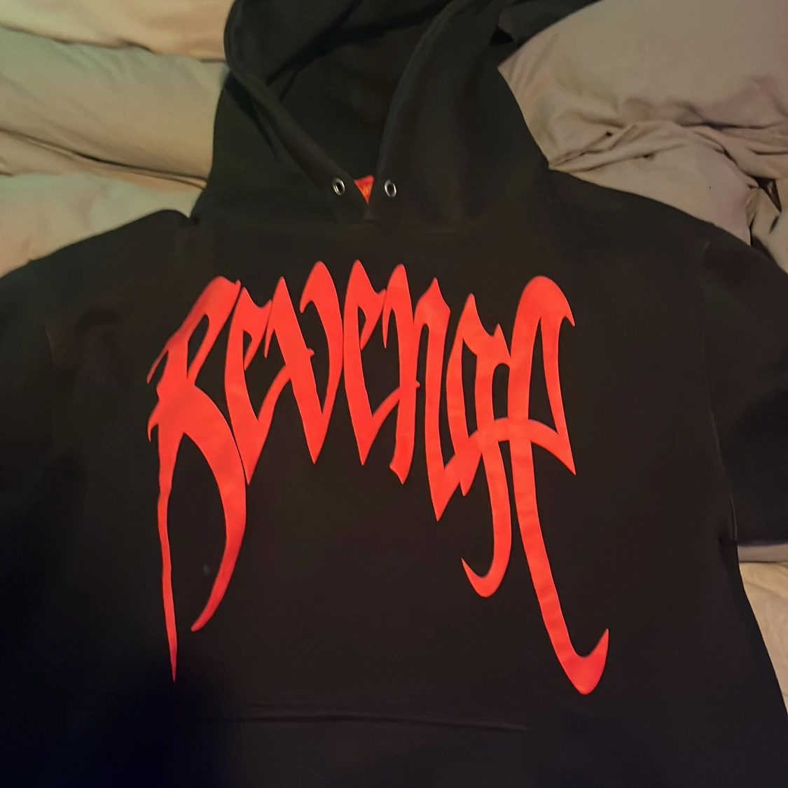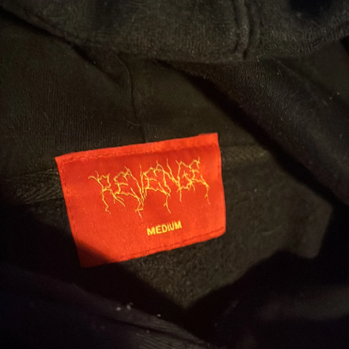 Svart hoodie från Revenge med stor röd logga framtill, fet röd handavtrycksprint på ryggen och texten 'Revenge Is In The Creators Hands' på ärmen. Klassisk huva och känguruficka, tillverkad i mjuk bomullsmix. Perfekt för dig som gillar streetwear med attityd.