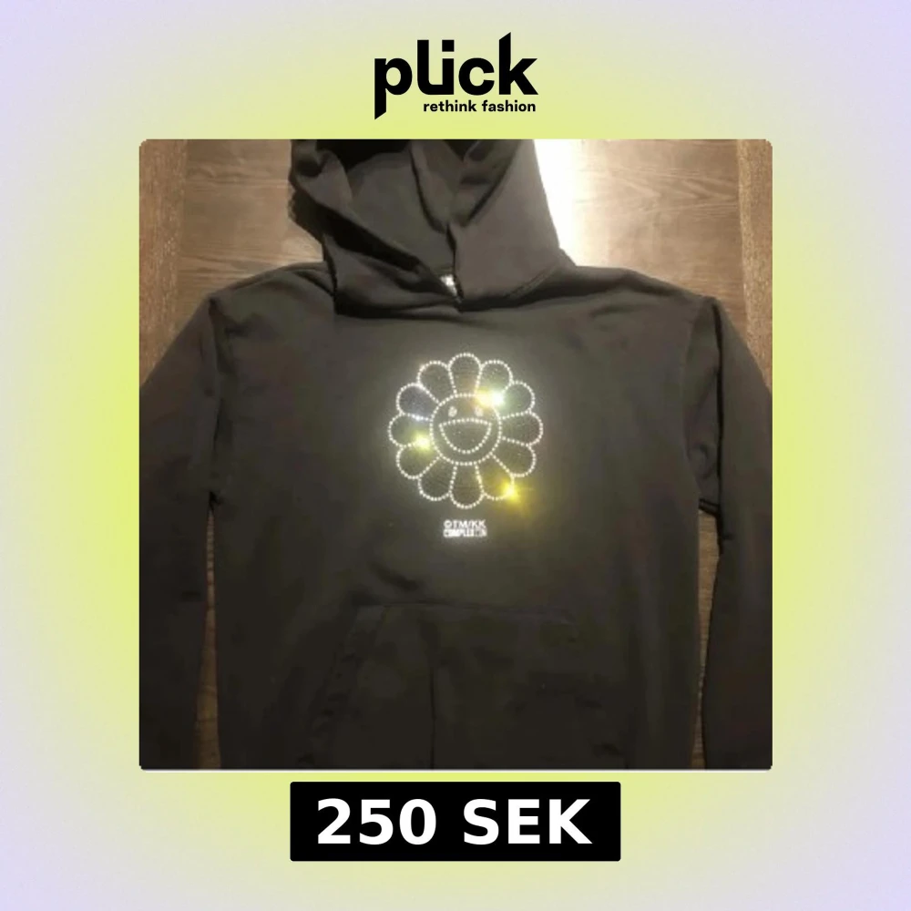 Svart hoodie med stor glittrig blomma i strass på bröstet. Klassisk huva, magficka och långa ärmar. Perfekt för dig som vill sticka ut med en unik och snygg detalj på din outfit.