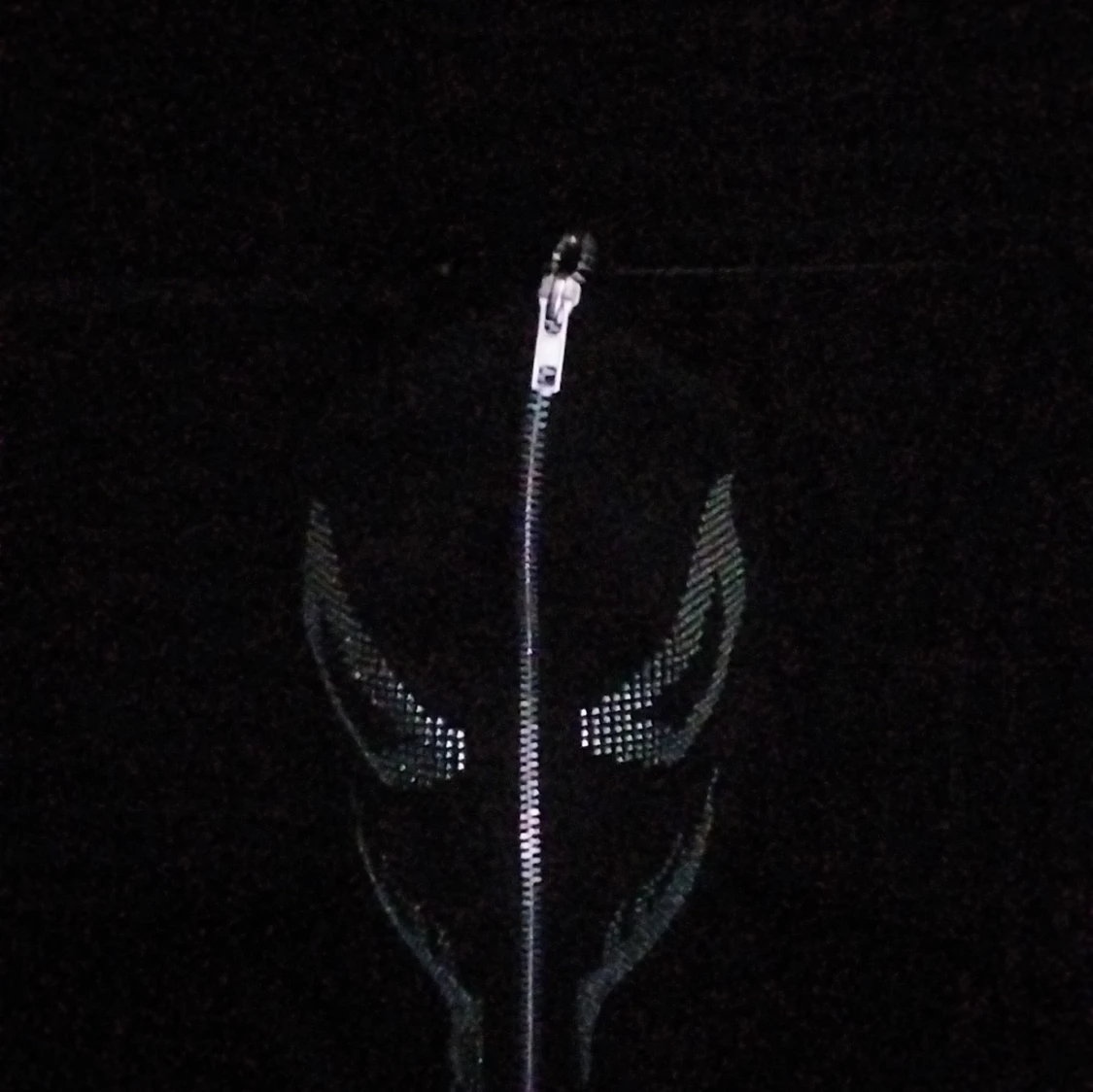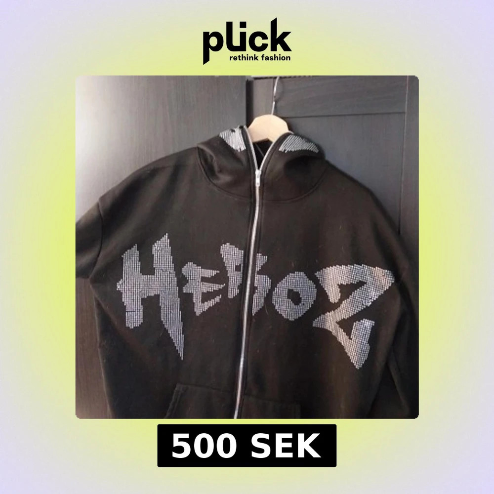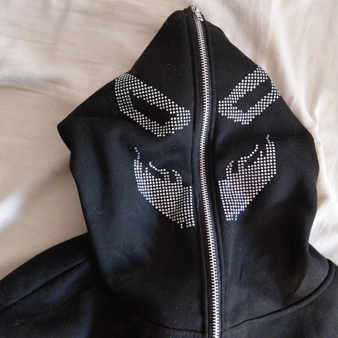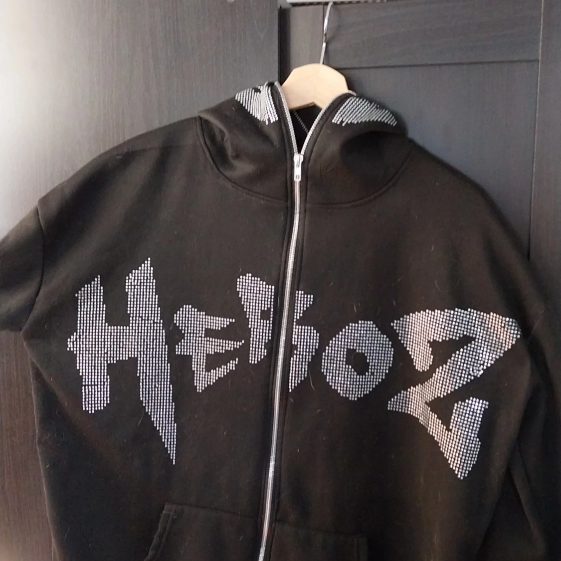 Svart Rhinestone zip hoodie med dragkedja hela vägen upp. Rhinestone text på framsidan och wingar på baksidan även ansikte på luvan. Inga rhinestones saknas. Aldrig använd. (Kan finnas lite hund hår på tröjan)