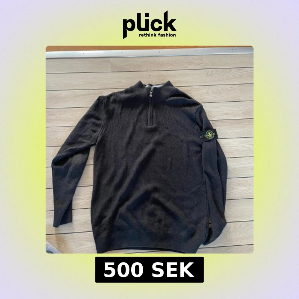 Svart stickad tröja från Stone Island med klassisk logga på ärmen. Tröjan har half zip i halsen och är långärmad med ribbade muddar. Perfekt för dig som gillar stilren och clean streetwear med premiumkänsla. Lite sönder vid märket syns knappt något.
