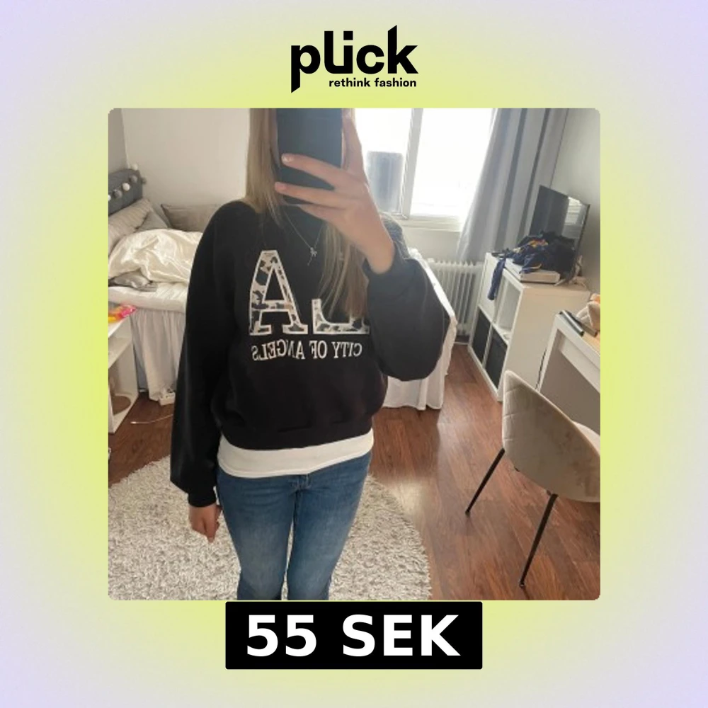 Svart sweatshirt från Gina Tricot med stort LA-tryck och texten 'City of Angels' framtill. Bokstäverna har mönster i beige och svart. Tröjan har rund hals, ribbade muddar och är långärmad. Perfekt för en chill och trendig look.