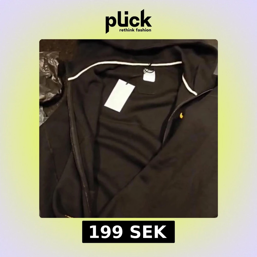 Svart hoodiejacka med vit kant längs huvan och dragkedja framtill. Jackan har en enkel och clean look, perfekt för dig som gillar streetwear. Liten gul detalj på bröstet. Skön och mjuk känsla.