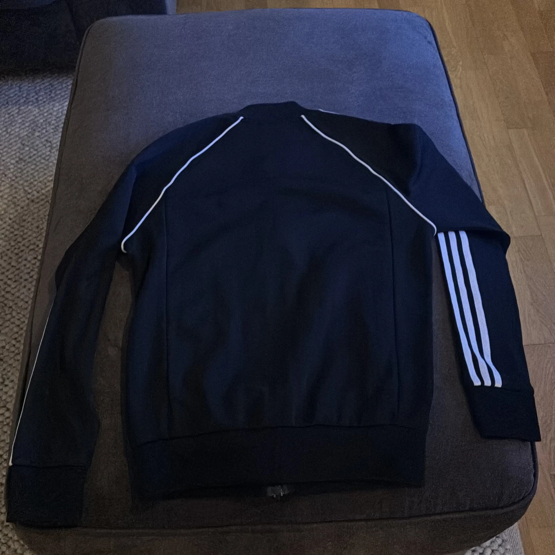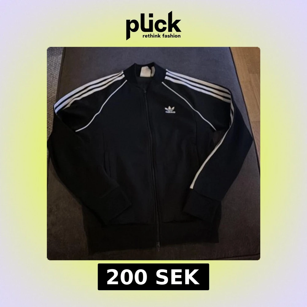 Säljer en klassisk svart träningsjacka från Adidas med vita ränder längs ärmarna och logga på bröstet. Jackan har dragkedja och långa ärmar, perfekt för sportiga tillfällen.