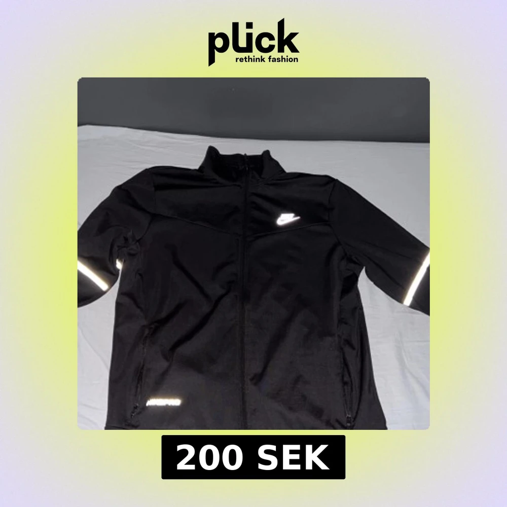 Säljer en svart träningsjacka från Nike med dragkedja och reflexdetaljer. Jackan har långärmade ärmar och en hög krage. Perfekt för löprundan eller gymmet.