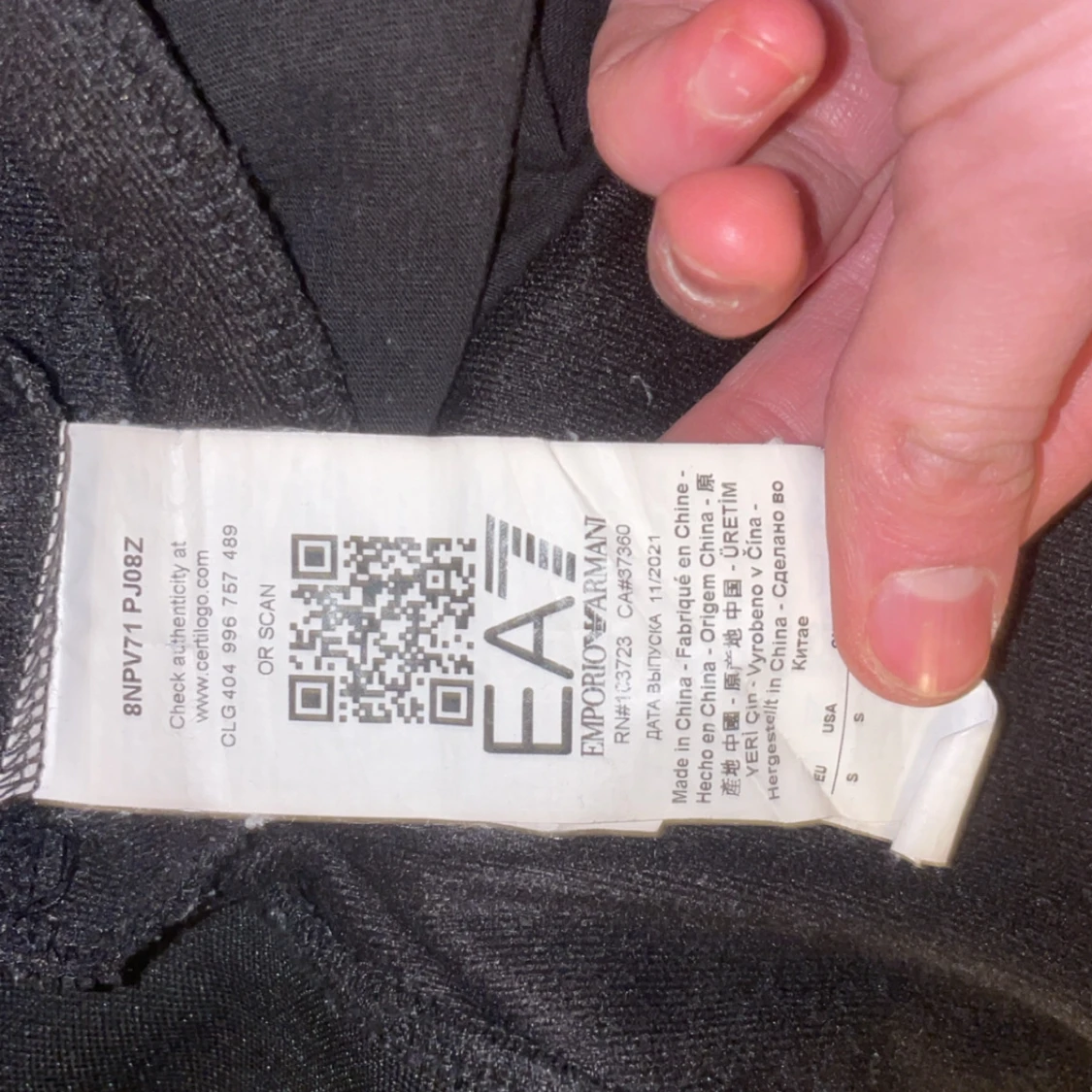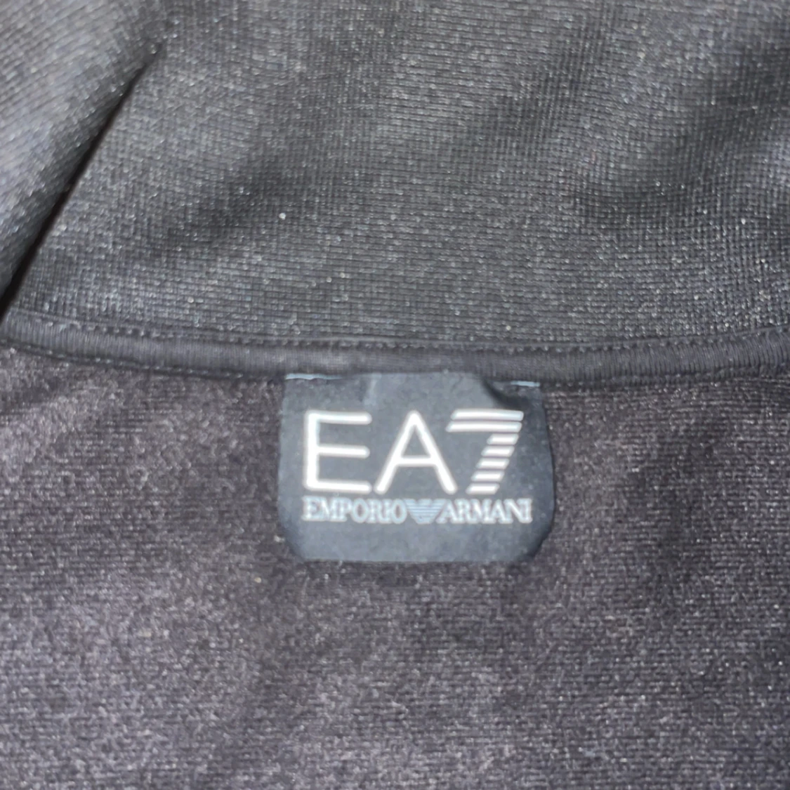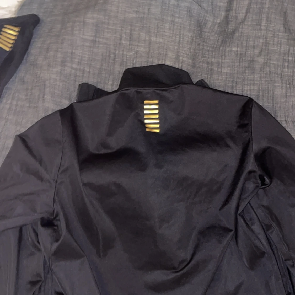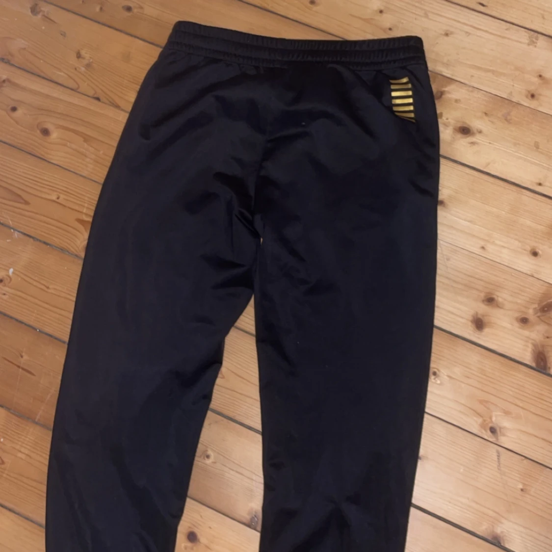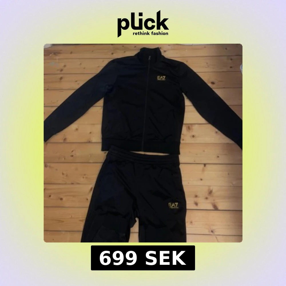 Snyggt svart träningsset från EA7 Emporio Armani med gulddetaljer. Setet består av en jacka med dragkedja och matchande byxor. Perfekt för en stilren look på gymmet eller till vardags.