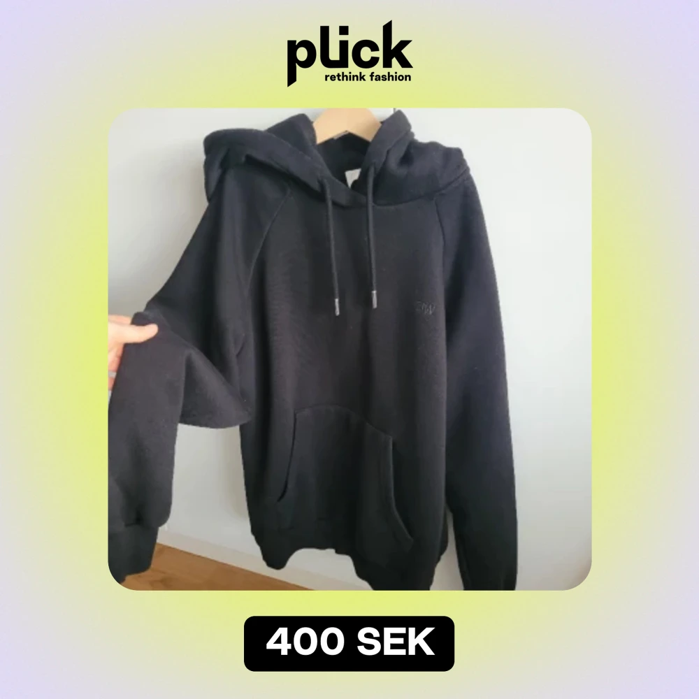 Svart hoodie från ICIW i storlek S, men oversized så passar mer som en M och även L. Jag brukar ha mellan XS och M och den passar med mycket utrymme. Ganska lång också, med luva och ficka, väldigt mjuk. Använd ca 2 gånger, köpt för 699.