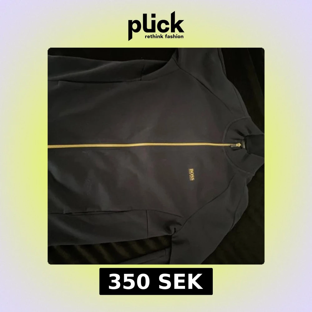 Svart jacka från BOSS med guldfärgad dragkedja och logga på bröstet. Jackan har hög krage, långa ärmar och är tillverkad i ett mjukt material som känns skönt mot huden.