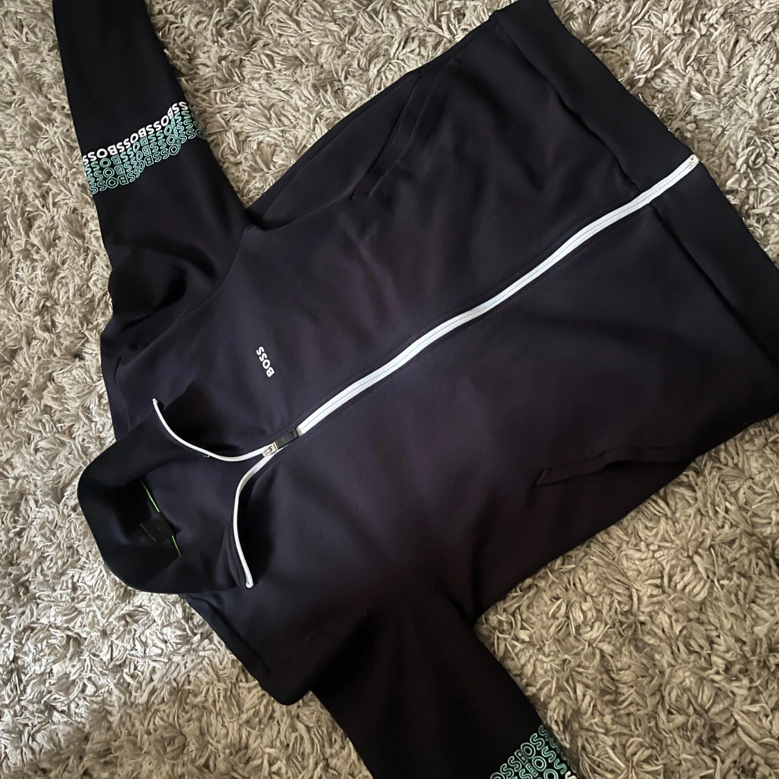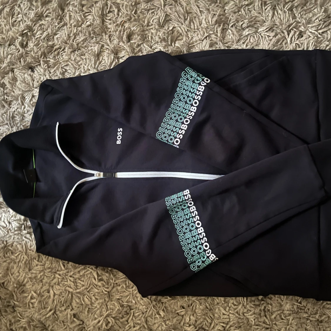 Svart jacka från BOSS med hel dragkedja och vit piping längs kragen. Tryckt BOSS-logga på bröstet och upprepade loggor i turkos och vitt på ärmarna. Mjuk och sportig känsla, perfekt för en chill look.