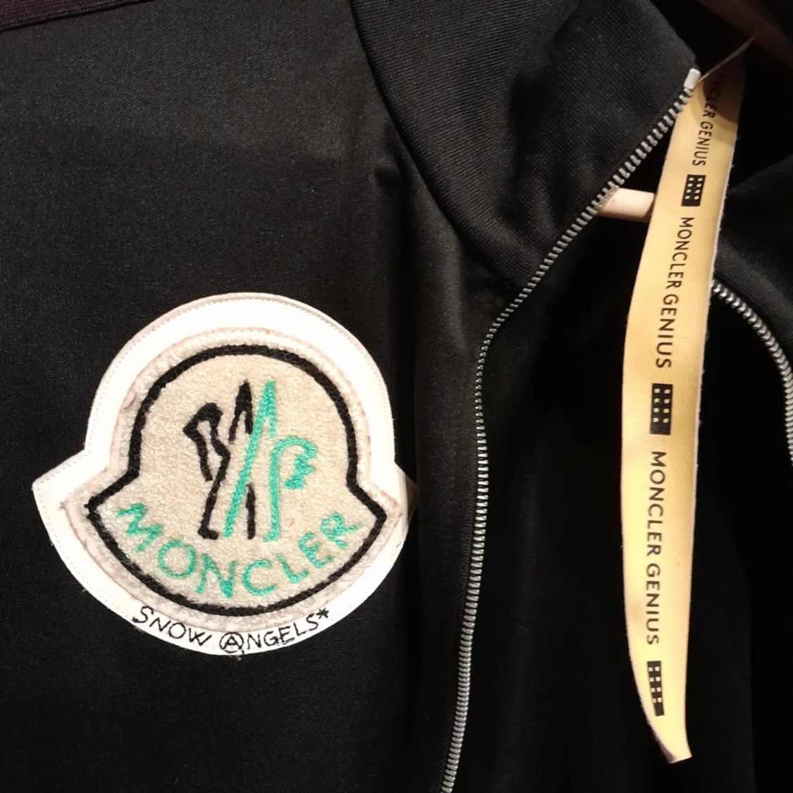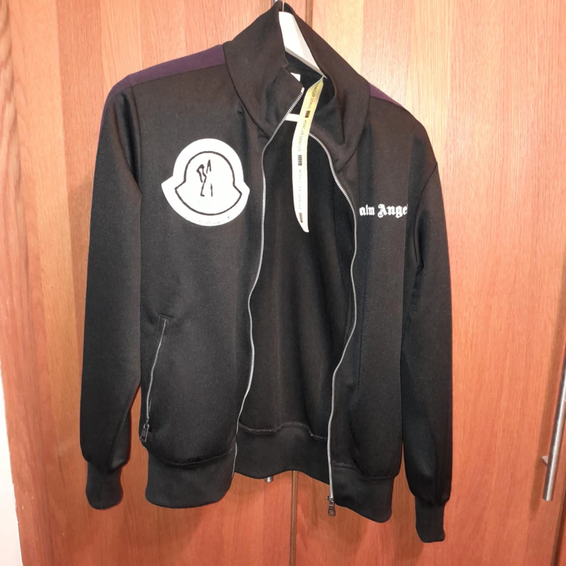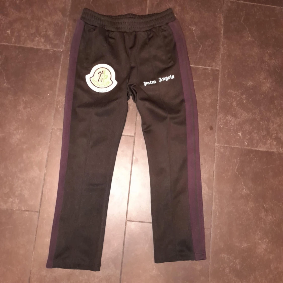 Snygga svarta byxor från Moncler x Palm Angels med lila sidopaneler och broderad logga. Byxorna har en elastisk midja för extra komfort och en avslappnad passform. Perfekta för en trendig och avslappnad stil. Jag själv har trivts i den då jag nu säljer den för hag växt ur den