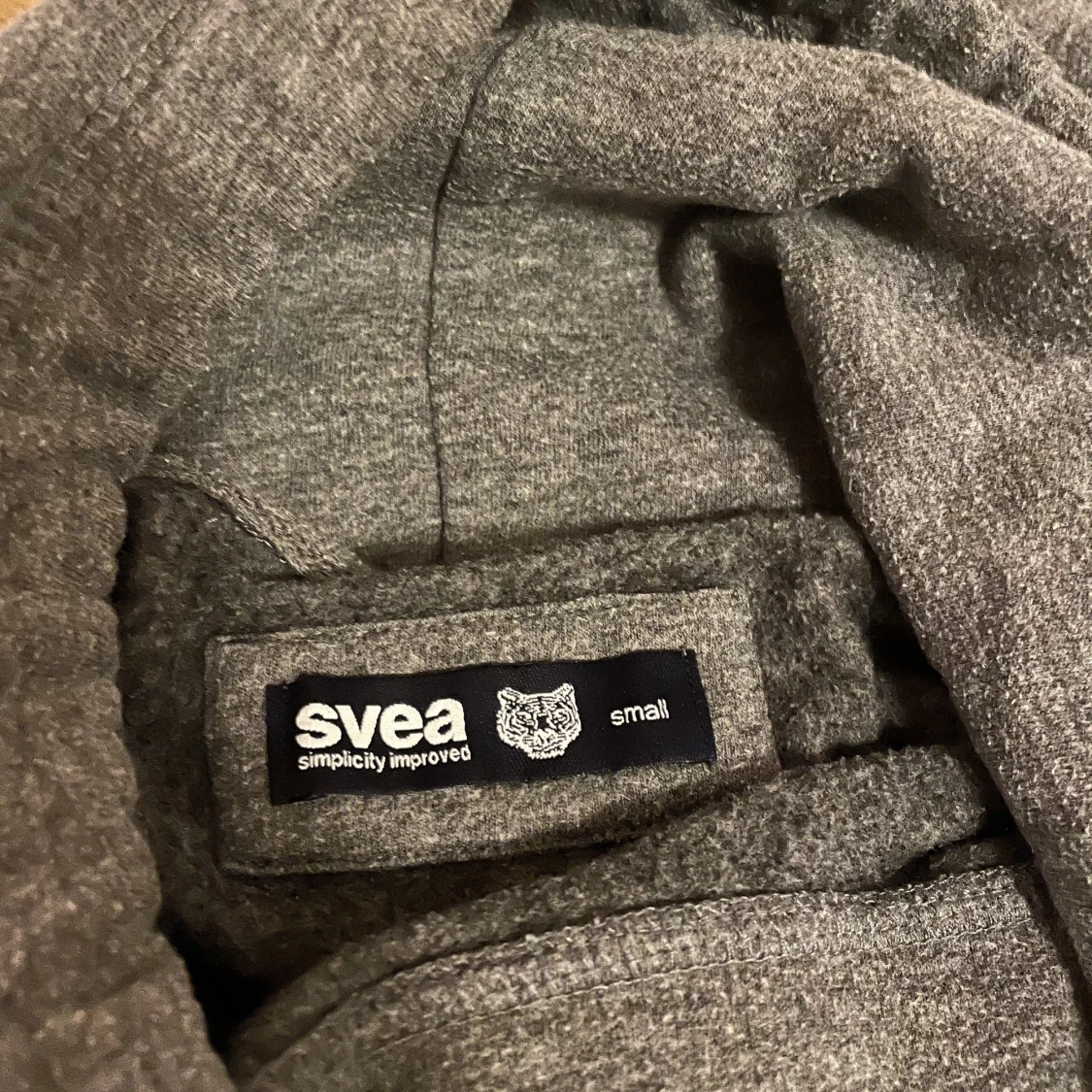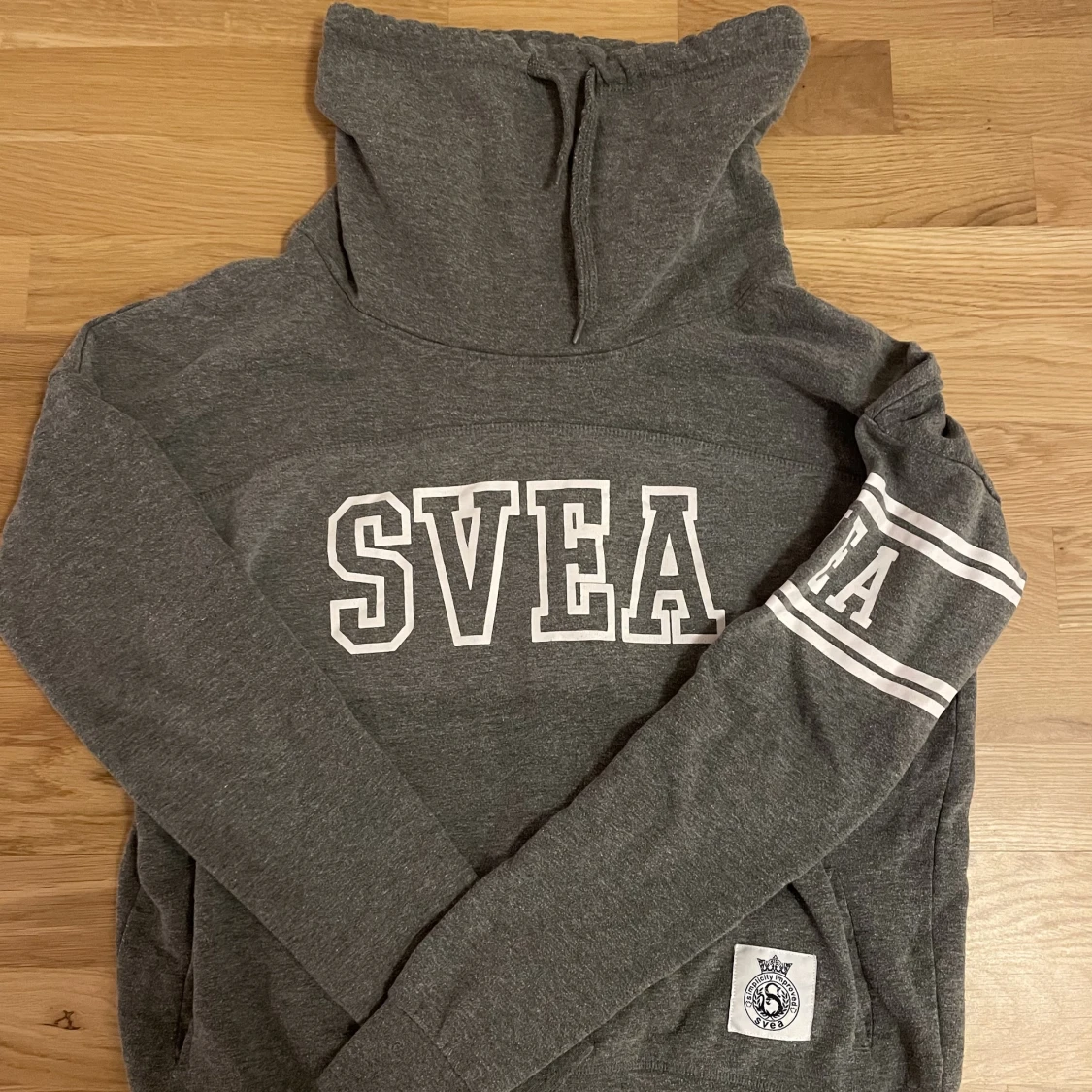 Superfin grå Svea hoodie med hög krage! Använd en del men fortfarande i bra skick, storlek S!