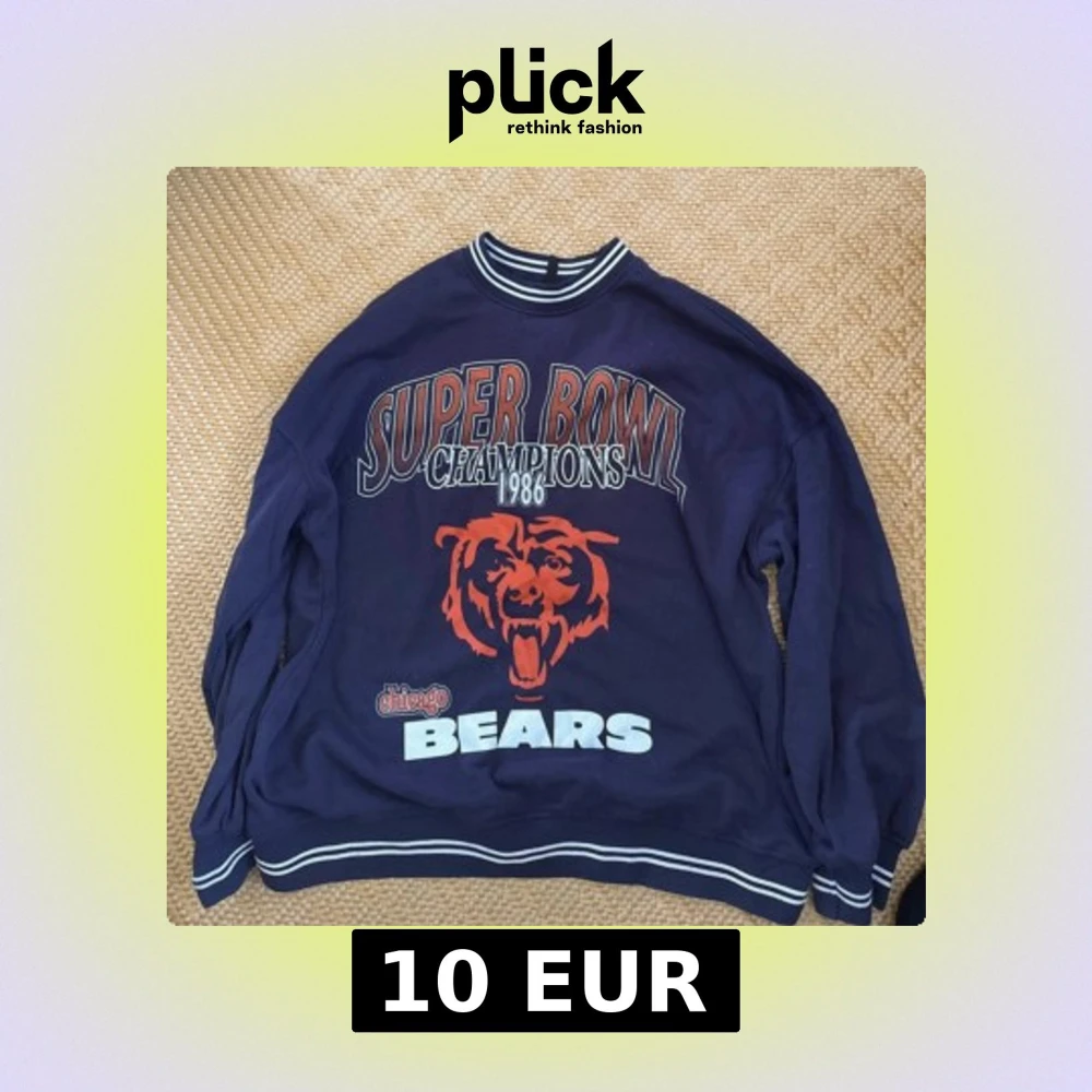Säljer en mörkblå sweatshirt med stort Super Bowl Champions 1986-tryck och Chicago Bears-logga framtill. Tröjan har vita och svarta ränder på krage, ärmslut och nederkant. Som ny!!