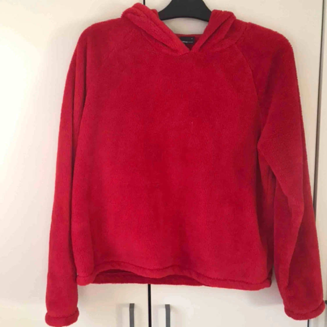 Klar röd luvtröja i jätte mysigt och varmt material! Inte använd mycket. Normal passform och längd.