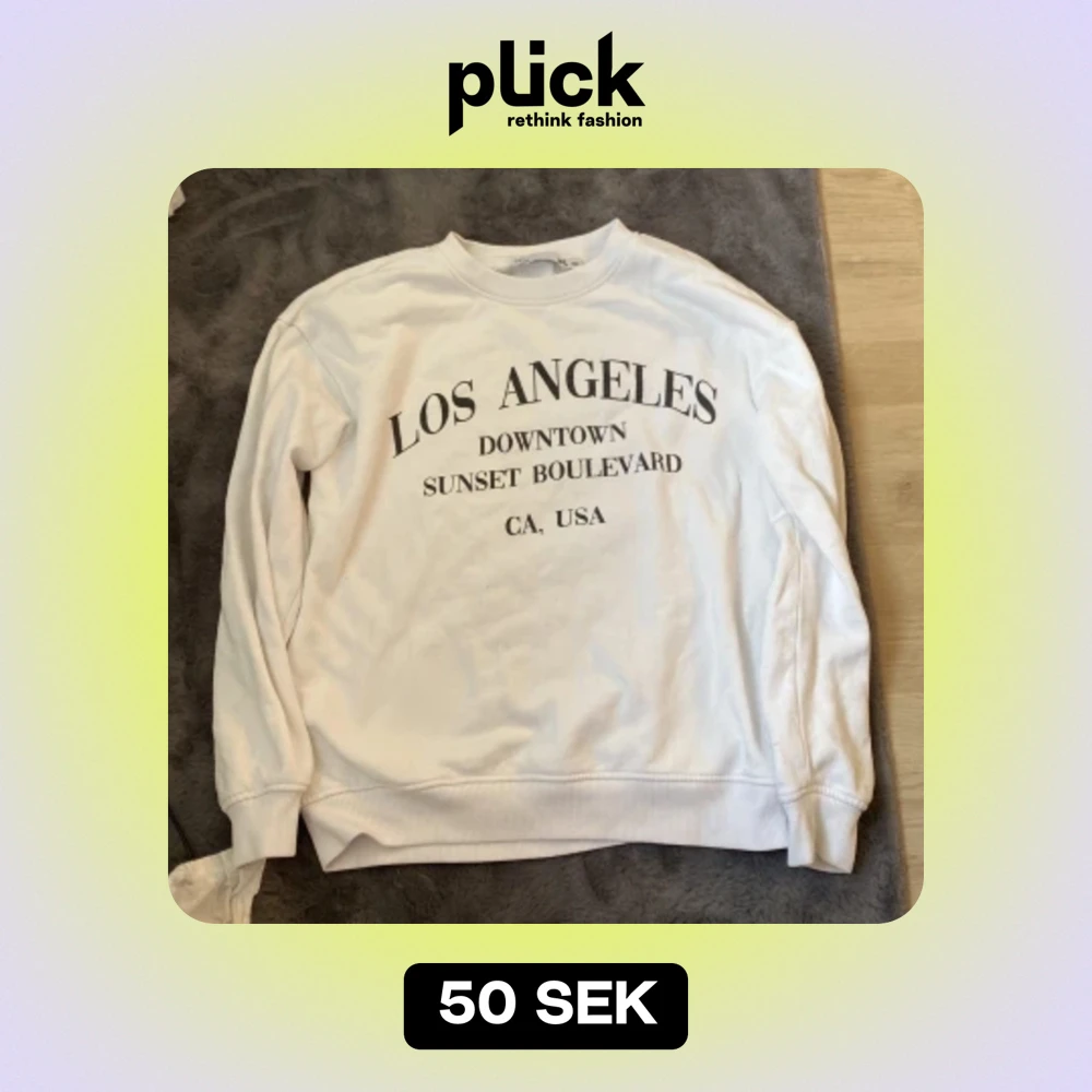 Vit tjocktröja med svart tryck. Tröjan är i storlek 150. Tröjan har lite små fläckar här och där!!
