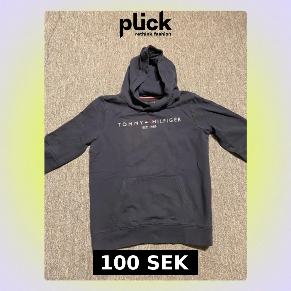 Snygg mörkblå hoodie från Tommy Hilfiger med broderad logga och text 'EST. 1985' på bröstet. Klassisk känguruficka framtill och huva. Perfekt för dig som gillar stilrena och bekväma plagg med streetkänsla. Storlek 164.