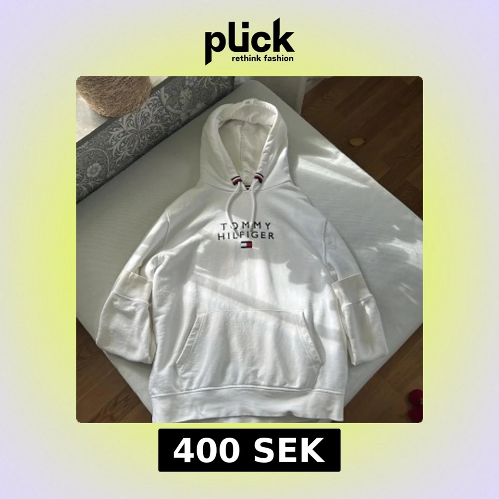 Vit hoodie från Tommy Hilfiger med broderad logga och flagga på bröstet. Klassisk känguruficka framtill, snörning i huvan och detaljer i rött, vitt och marinblått. långärmad modell,