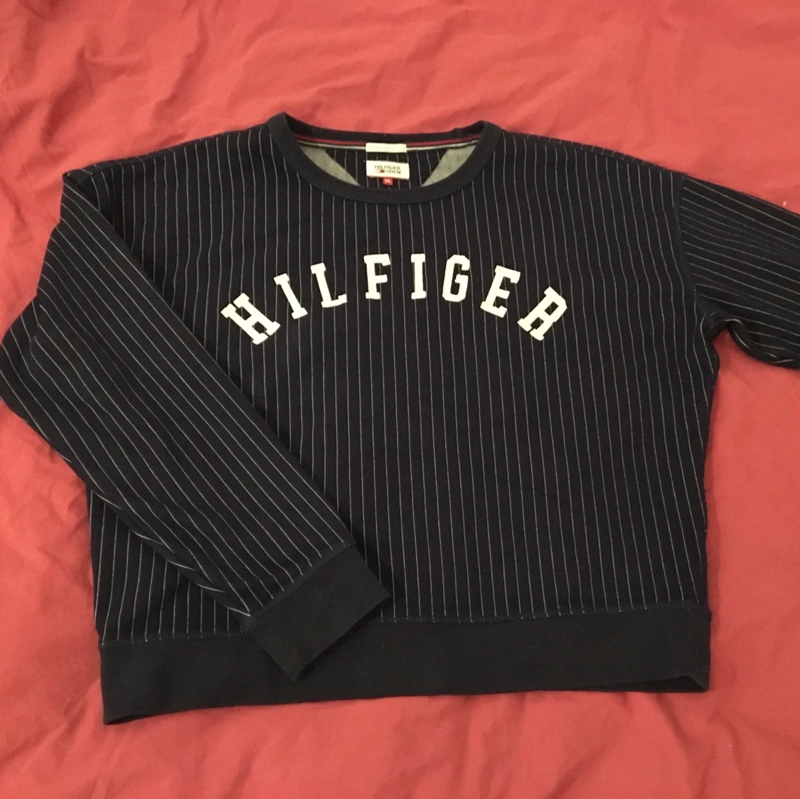 Mörkblå randig Tommy Hilfiger sweatshirt. Står att det är storlek XL men den sitter mer som en S/M. Använd men i bra skick!