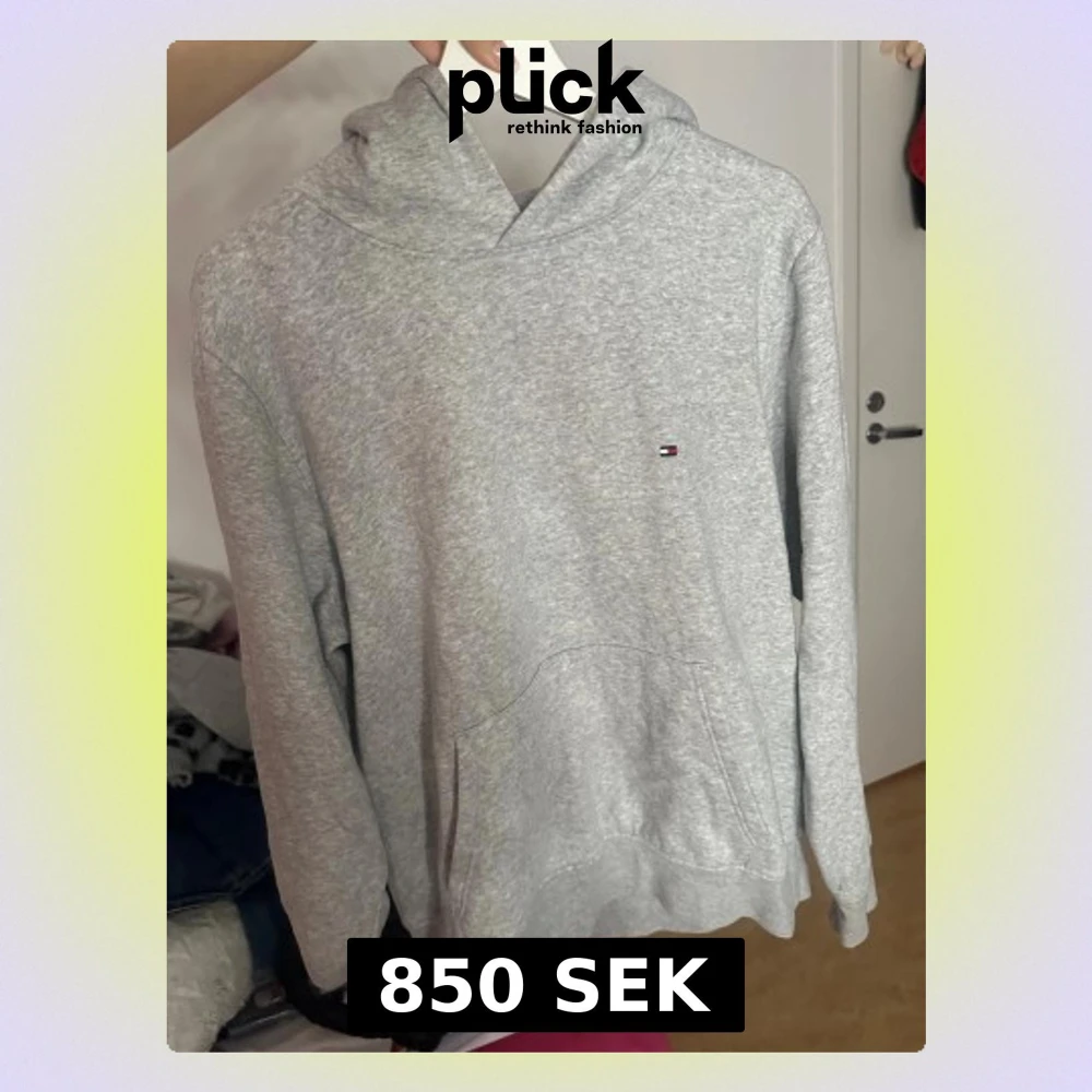 Snygg grå hoodie från Tommy Hilfiger i storlek XL. Tröjan har en klassisk huva, magficka och det lilla Hilfiger-logotypen broderat på bröstet. Mjuk bomullskänsla och stilren design som funkar till jeans eller joggers.