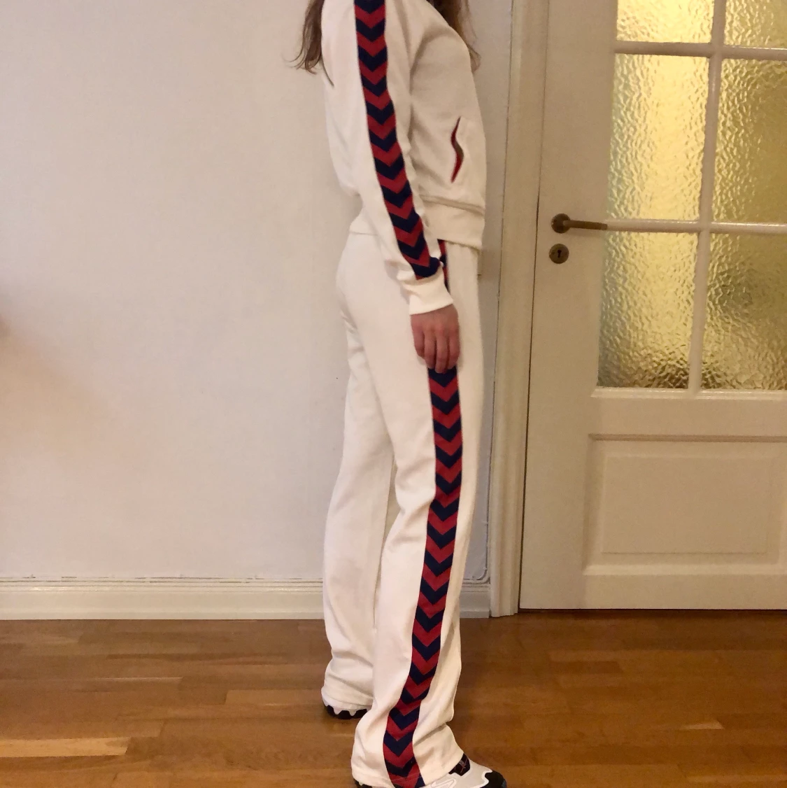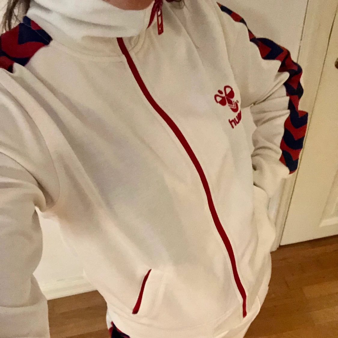 Jättefin tracksuit från Hummel! Vit med blå/röda revärer. Båda delarna är märkta storlek Large men de är snarare Medium. Jag som bär den har small och den är något stor på mig. Byxorna är långa i benen (jag är 169 cm).