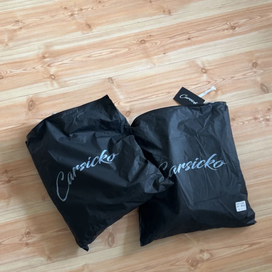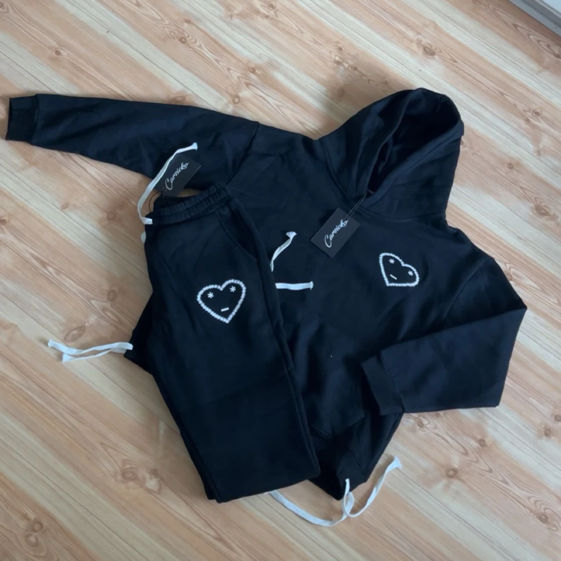 Säljer två tracksuits från Carsicko i grått och svart. Hoodiesarna har dragsko i midjan byxorna har elastisk midja med snörning. Perfekt för en avslappnad stil.