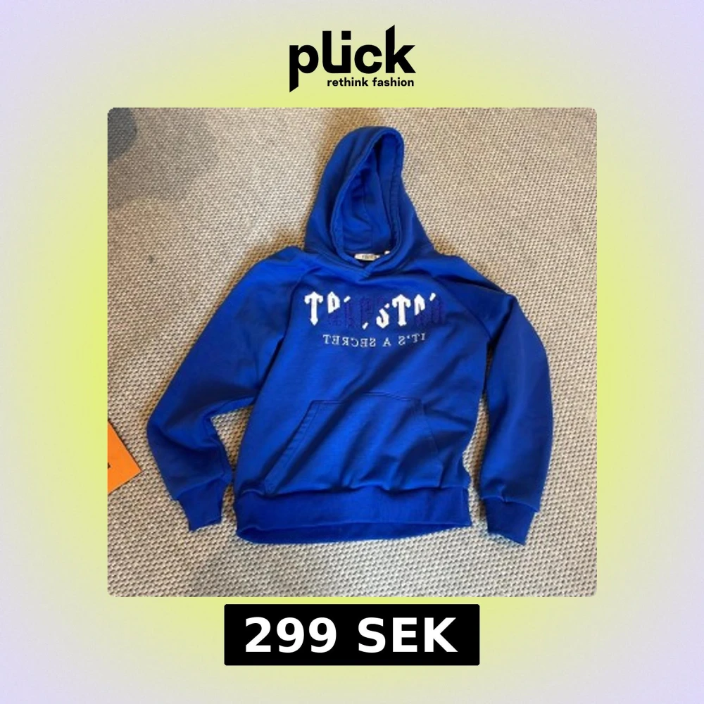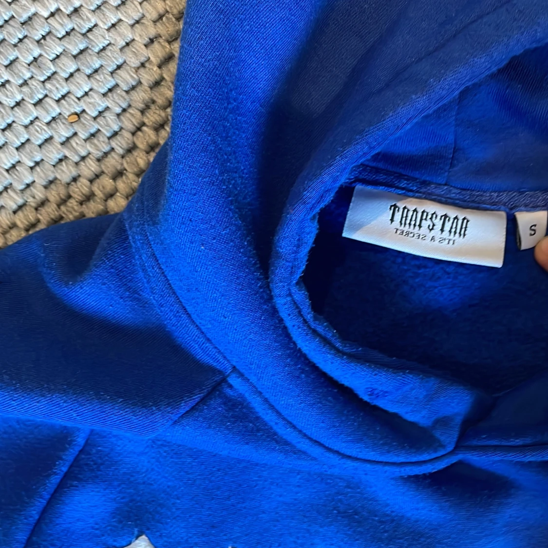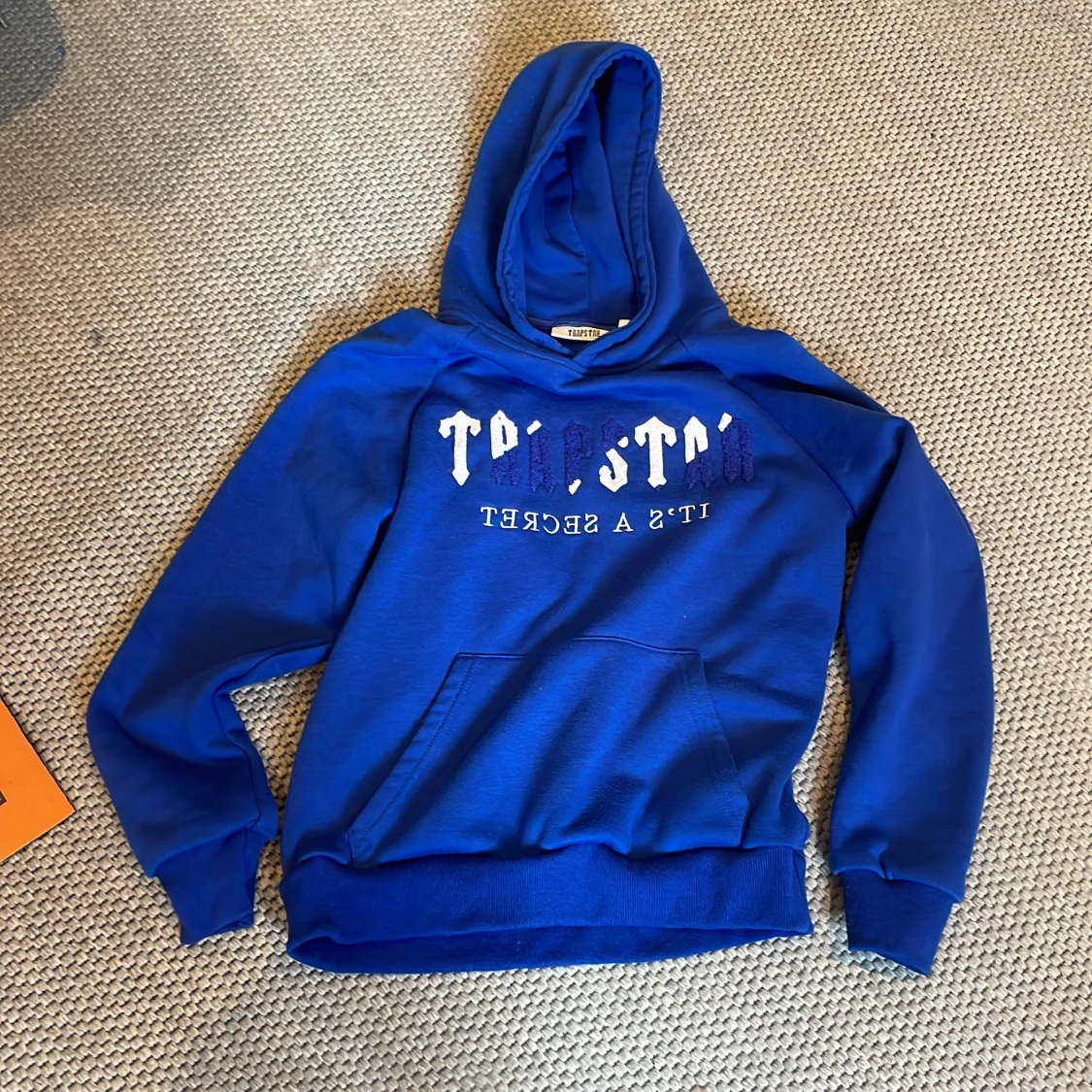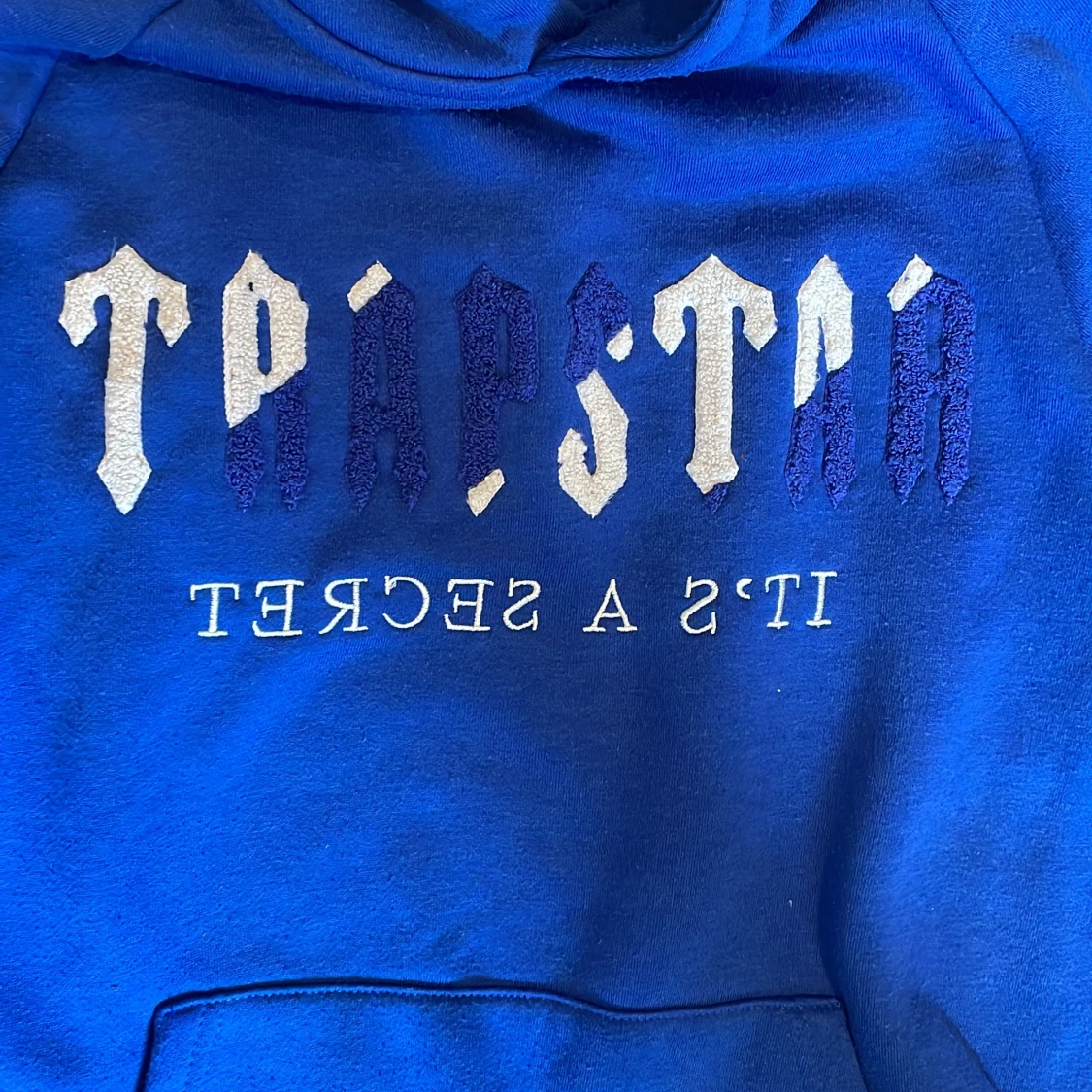 Säljer en blå hoodie från Trapstar med vit och blå broderad text på bröstet där det står 'Trapstar' och 'It's a secret'. Tröjan har huva och en stor magficka framtill. Perfekt för dig som gillar streetwear.
