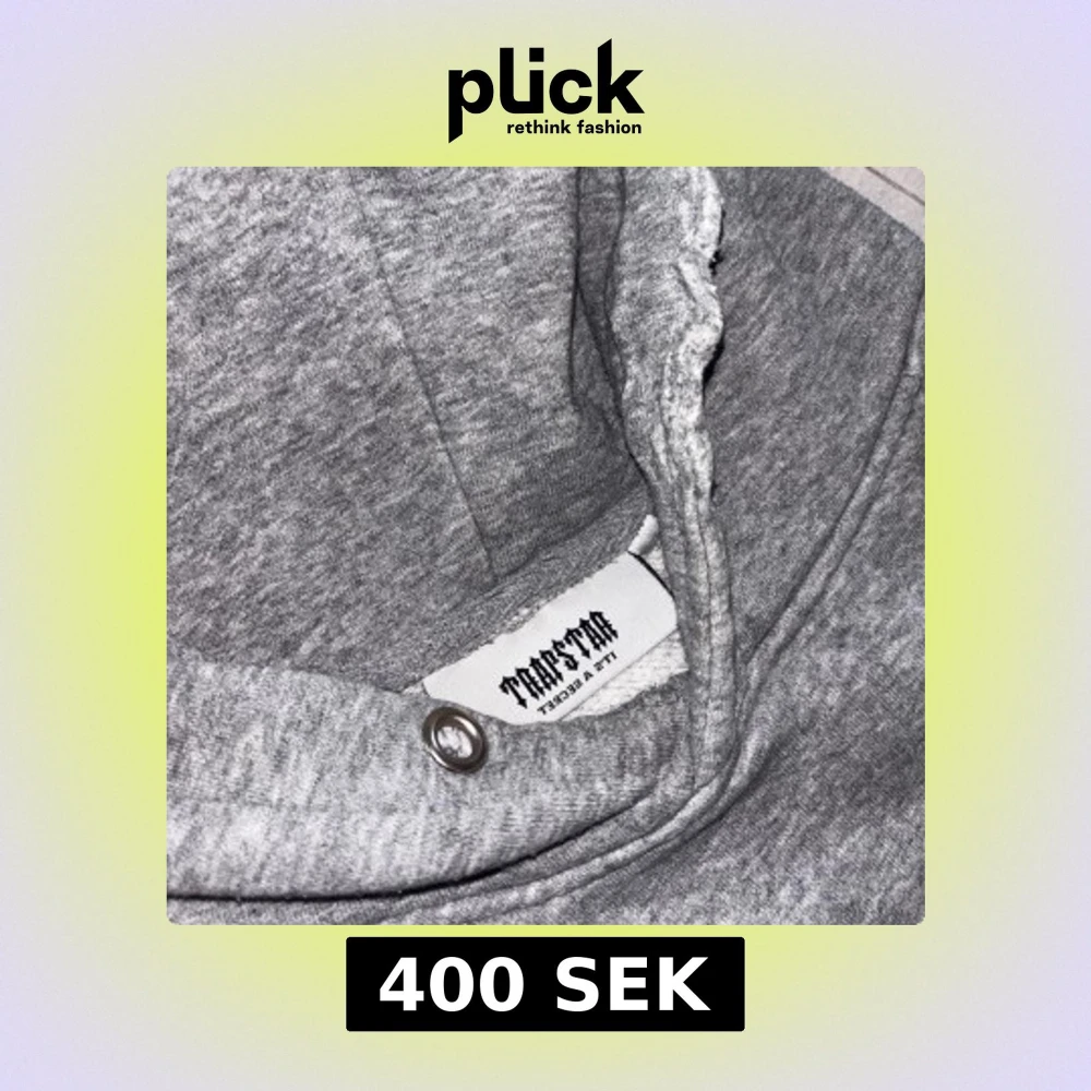 Säljer en grå hoodie från Trapstar med stor logga i blått, vitt och svart framtill. Tröjan har huva med snörningshål, magficka och långa ärmar. Perfekt för dig som gillar streetwear och vill ha en chill look. Snören är tyvärr borta och den är lite sliten